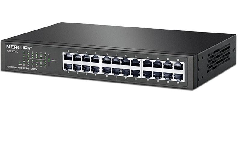 MERCURY水星S124D24是一款专为中小企业办公环境设计的24口百兆机架式交换机,具备稳定可靠的性能与简洁高效的管理功能。该交换机提供24个10/100Mbps自适应以太网端口,支持即插即用,满足多设备接入需求,有效扩展局域网覆盖范围。采用金属外壳设计,具备良好的散热性与抗干扰能力,适合7×24小时连续运行。支持IEEE 802.3、802.3u等标准,具备自动MDI/MDIX识别功能,简化布线。安装便捷,可轻松部署于标准19英寸机柜中,节省空间。S124D24以高性价比、低功耗和稳定传输著称,是企业办公网络集线、分线及基础数据交换的理想选择,助力构建高效、稳定的办公网络环境。