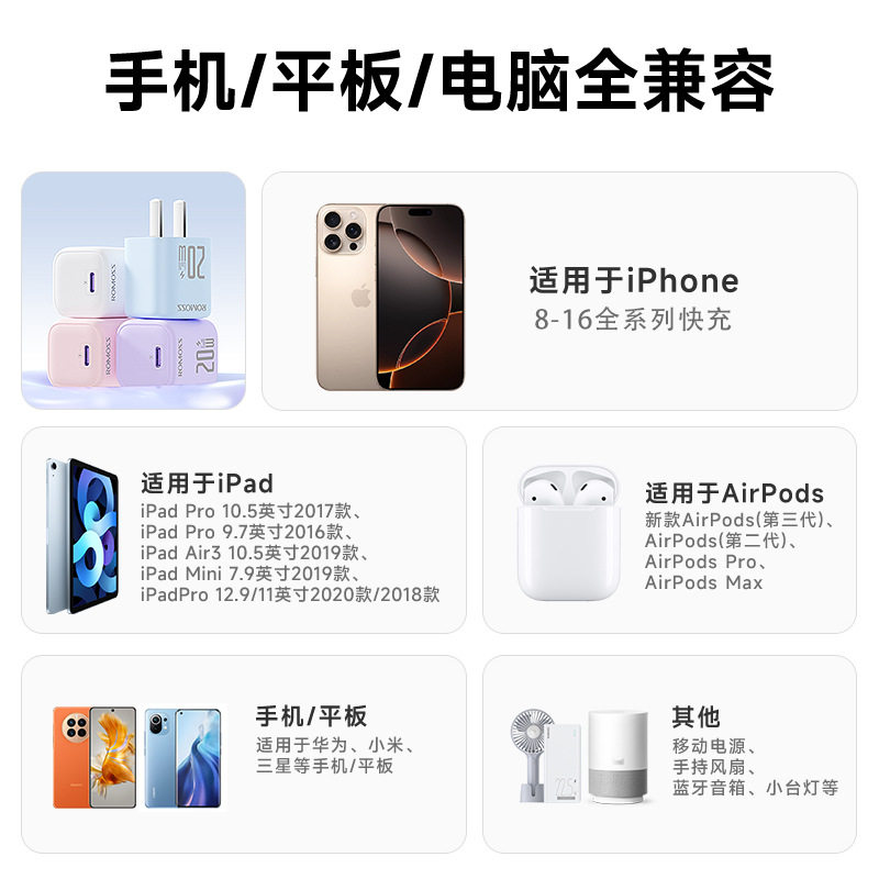罗马仕迷你充电头专为iPhone 8至iPhone 16系列设计,支持PD30W快充协议,兼容苹果全系设备,包括iPad。其小巧便携的体积轻松放入口袋或包中,出行携带无负担。采用高品质材料与智能温控技术,充电安全高效,有效保护电池寿命。支持USB-C接口,输出稳定,30分钟可为iPhone充至约50%电量,大幅提升充电效率。无论是日常通勤、差旅办公还是户外旅行,这款迷你充电头都能满足你对快速、安全、便捷充电的需求,是苹果用户的理想充电伴侣。