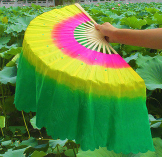舞蹈扇子火焰扇加长扇跳舞扇三色渐变真丝扇广场舞长绸舞蹈扇长扇