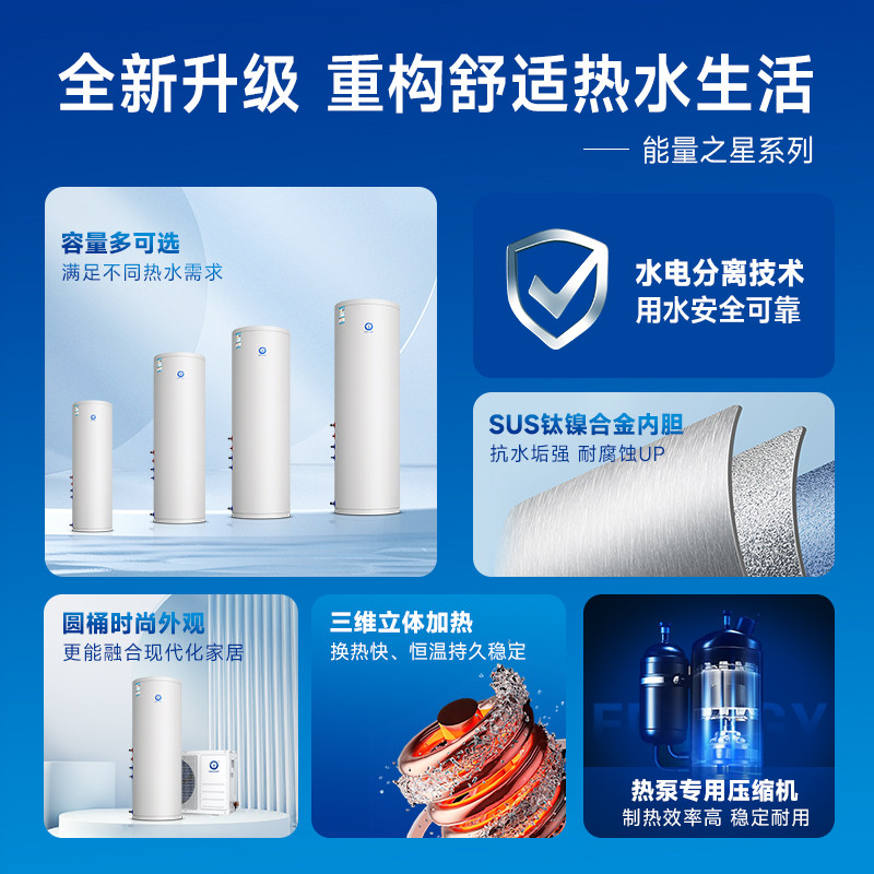 纽恩泰空气能家用分体双模式SUS钛镍合金内胆热泵热水器“能量之星”,采用先进热泵技术,高效节能,能效比高达4.2以上,省电75%以上。其核心内胆采用SUS钛镍合金材质,具备超强耐腐蚀性与抗压性能,使用寿命长达15年以上。双模式设计支持空气能加热与电辅热智能切换,确保全天候稳定热水供应。分体结构安装灵活,适用于多种家庭环境。产品通过国家一级能效认证,环保低碳,荣获“能量之星”称号,是追求高品质、节能舒适生活的理想选择。静音运行、智能控制,带来安全、便捷、持久的热水体验。