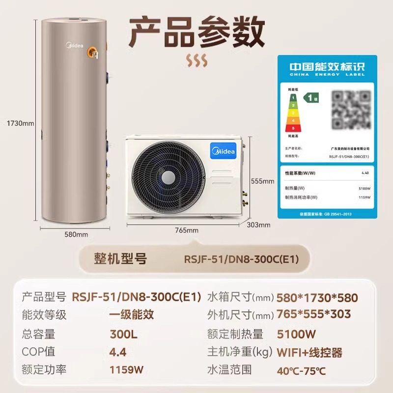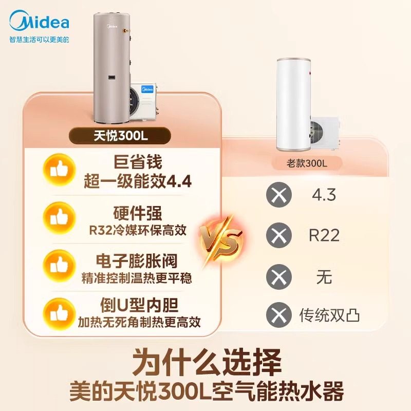 天猫美的空气能热水器家用热泵电辅速热洗浴热水器天悦一级能效300升