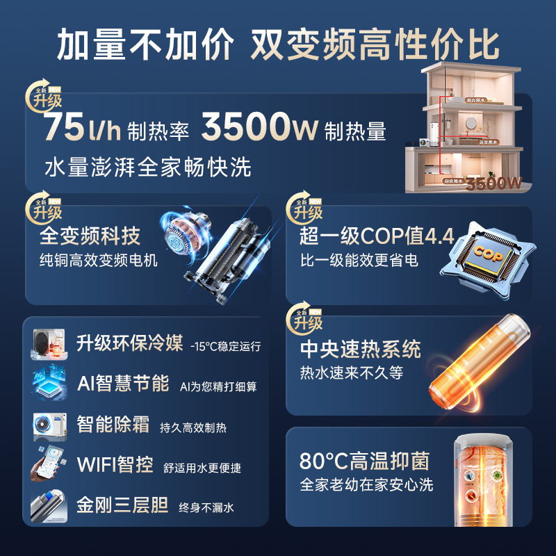 天国补海尔空气能热水器家用一级能效统帅变频200升L大容量自建房M2