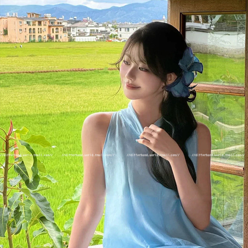 天猫超仙蓝色花朵抓夹发夹女新中式氛围感度假侧边夹头饰仿真头花发饰