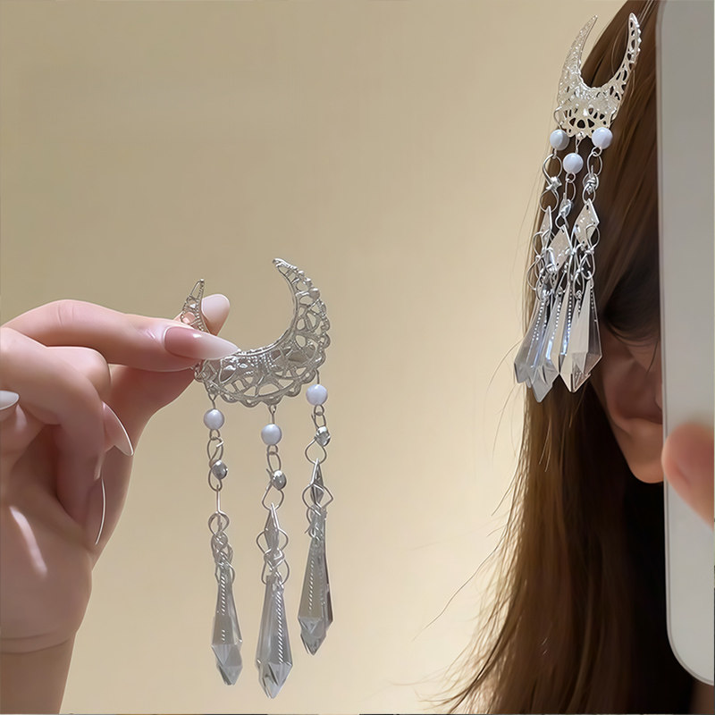 淘宝清冷感新中式古风战国袍月牙流苏发夹民族风汉服掩鬓侧边发卡头饰