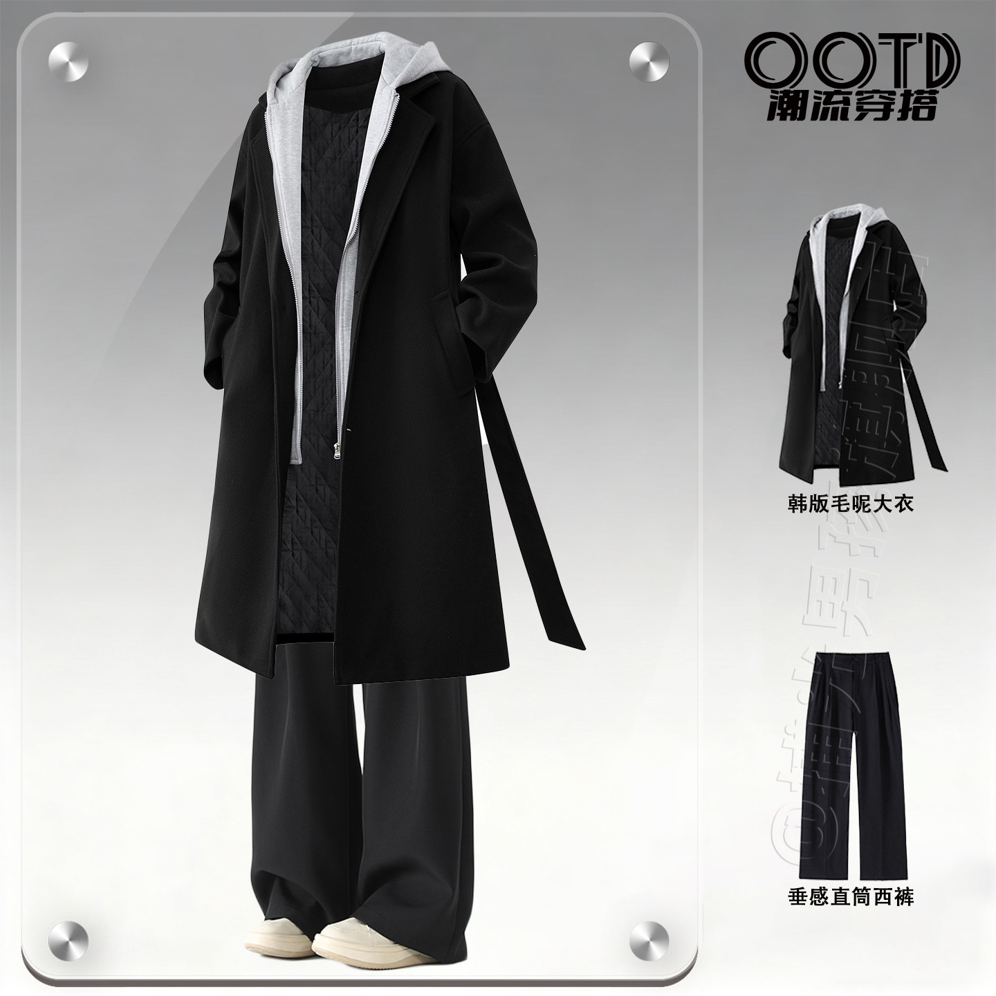 淘MRCYC长款毛呢大衣男秋冬季韩系宽松高级感加棉加厚呢子风衣外套