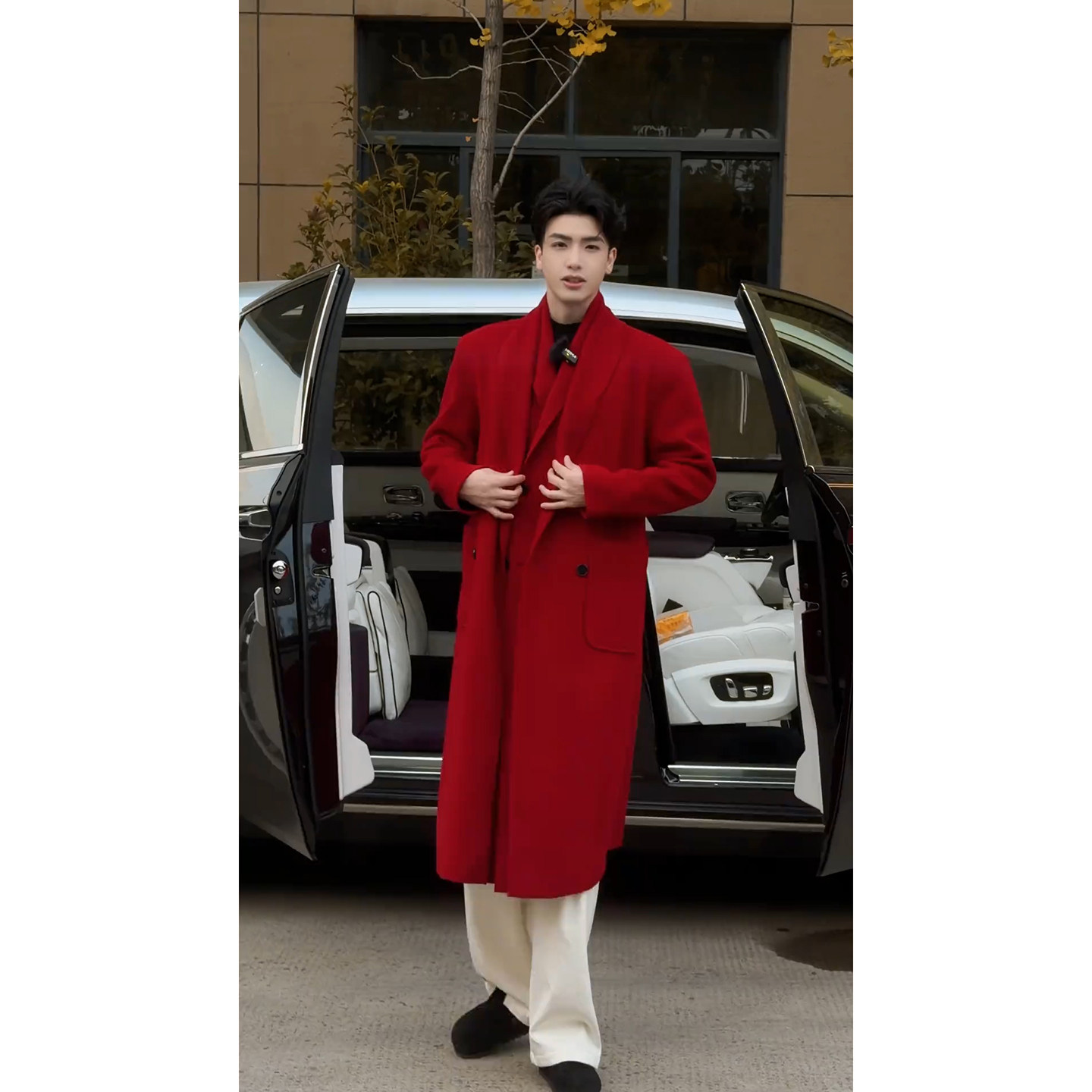天猫安哥拉红长款毛呢风衣男轻奢高级感双层领外套韩版英伦风西装大衣
