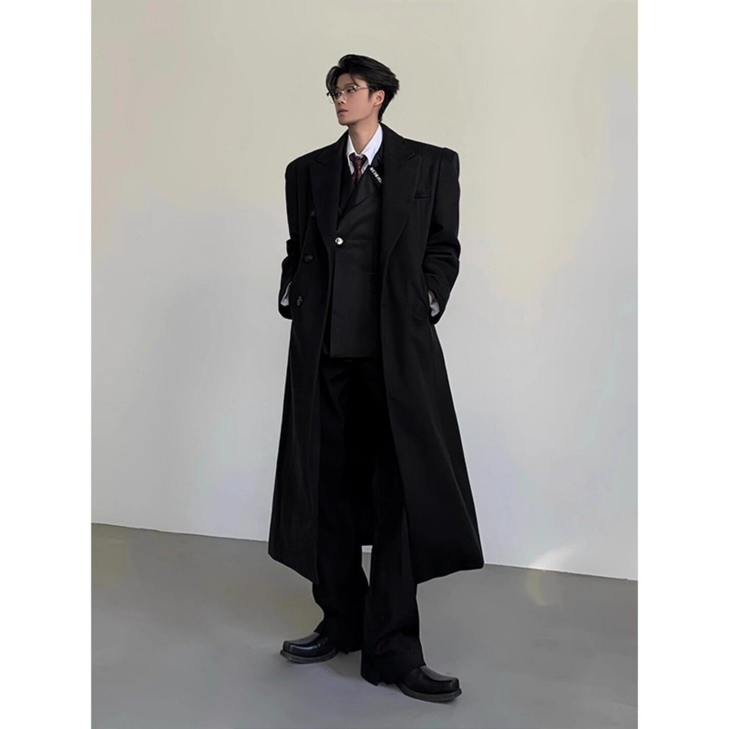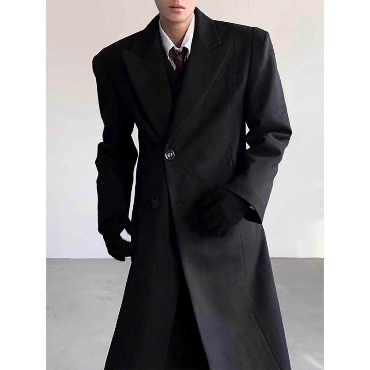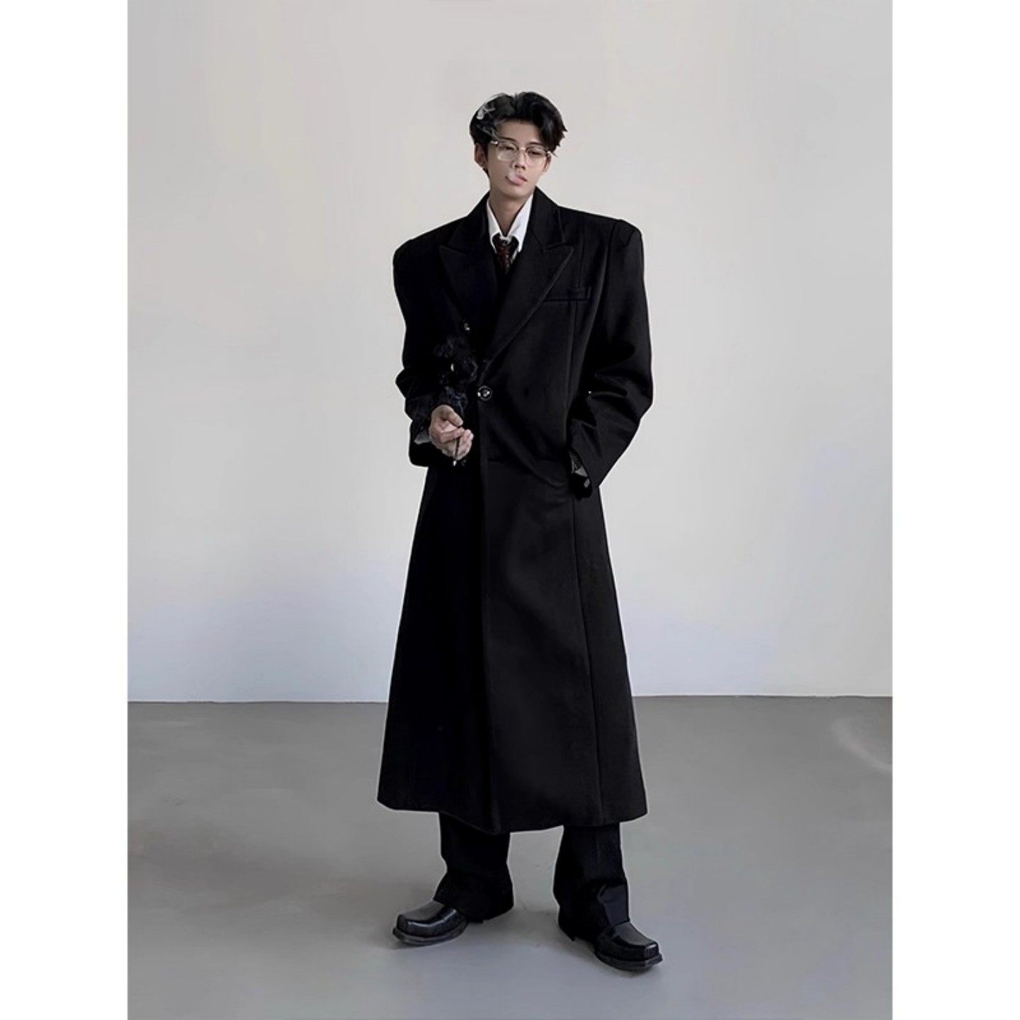 天猫黑色男士长款毛呢风衣秋冬雅痞英伦风垫肩大衣高级感正肩教父外套