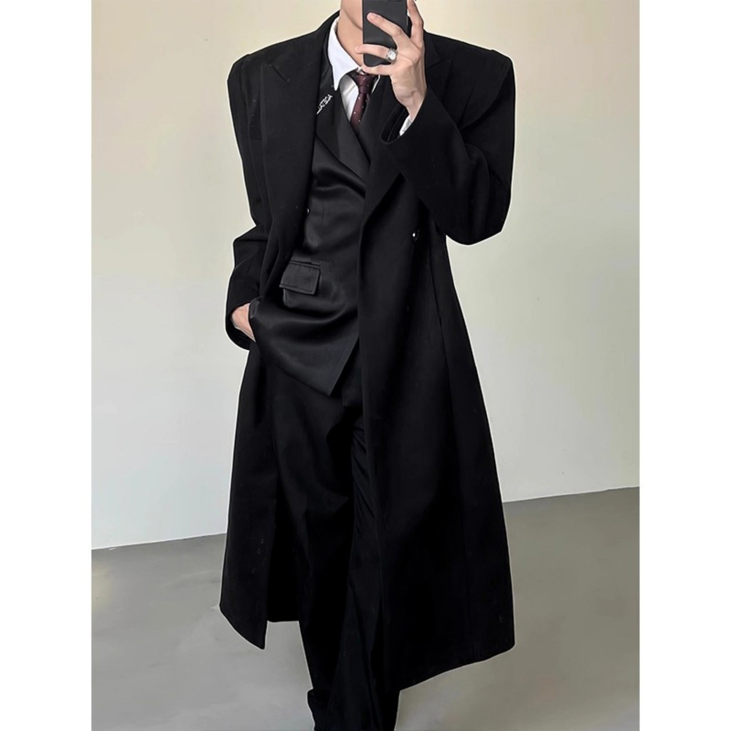 天韩版英伦风尼大衣高级感男秋冬中长款过膝西装外套三件套毛呢风衣