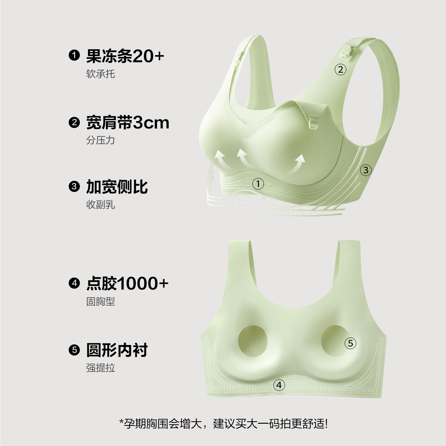 有棵树孕妇哺乳内衣专为孕期及产后女性设计,采用反重力承托科技,有效缓解乳房胀痛,预防下垂。高弹侧边与宽幅下围设计,紧密收拢副乳,塑造自然胸型,提升穿着舒适度。精选柔软透气面料,亲肤无刺激,支持单手开合哺乳扣,方便产后喂养。无钢圈结构减少压迫,适应孕期胸部变化,兼顾支撑与舒适。通过严格QC质检,确保每一件内衣品质可靠。无论是孕期日常穿着还是产后哺乳,有棵树文胸都以贴心设计守护妈妈健康与美丽,是准妈妈和新手妈妈的理想之选。