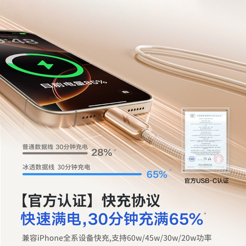 这款45W冰透快充数据线专为苹果iPhone 15 Pro、14、13及iPad、MacBook等设备设计,采用双Type-C接口,支持PD快充协议,最大输出功率达45W,充电速度更快,高效安全。线身采用高强度尼龙编织工艺,抗拉扯、防缠绕,耐用性显著提升。透明冰透外观时尚美观,展现内部精密结构,兼具科技感与实用性。兼容车载充电器、平板及多款快充设备,无论是日常使用还是出行充电都能轻松应对。支持数据传输与快速闪充双重功能,是苹果用户追求高效充电体验的理想选择。