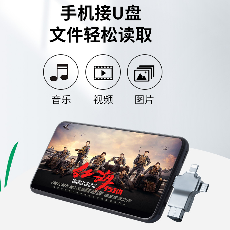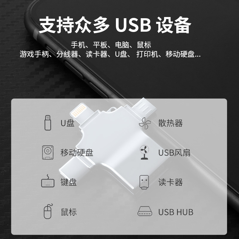OTG转接头三合一手机U盘转换器是一款多功能通用型数据线,支持Type-C、Lightning和USB 3.0接口,广泛适用于苹果、华为、小米等安卓设备。它集OTG转接、U盘读取、数据传输于一体,可轻松连接U盘、移动硬盘、键盘、鼠标等外设,实现手机与存储设备间的快速文件互传。采用USB 3.0高速传输技术,读取速度快,稳定性强。小巧便携,即插即用,无需驱动,是手机扩容、办公娱乐的理想配件。无论是备份照片、传输文档,还是播放视频,都能轻松应对,满足多场景使用需求,堪称数码生活的万能助手。
