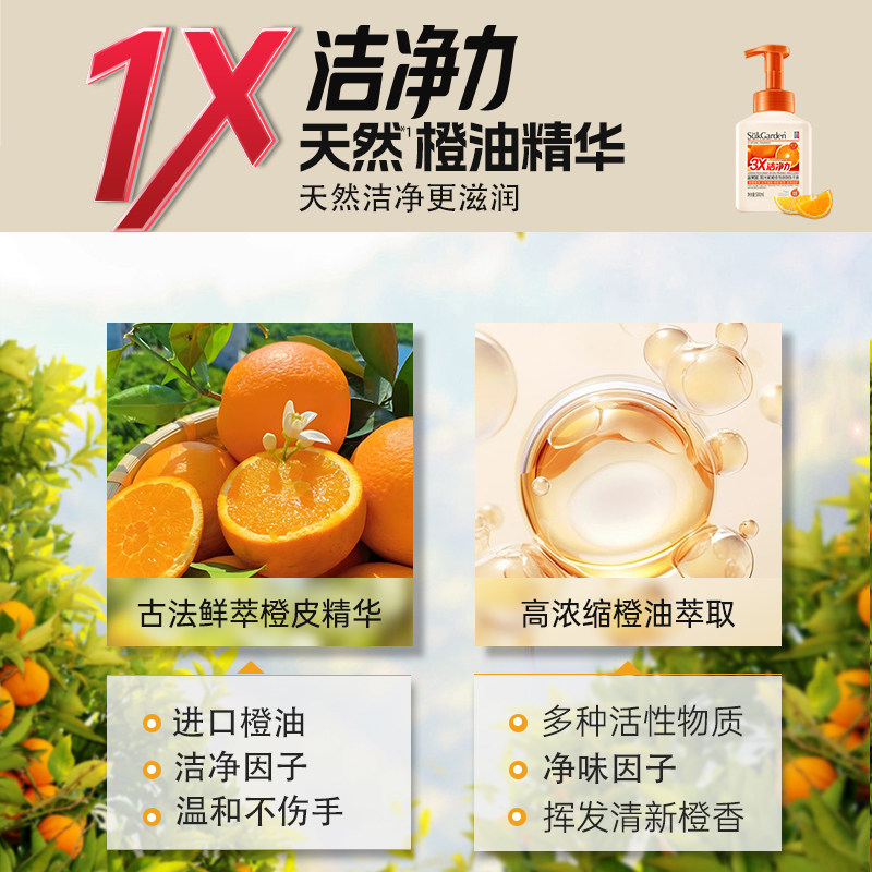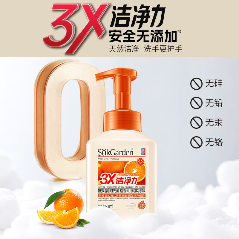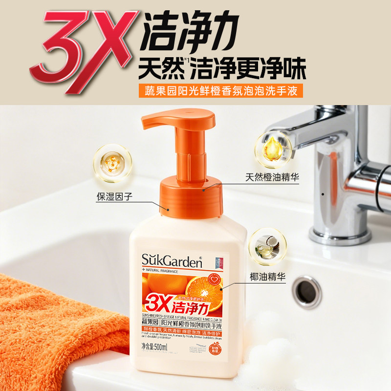 蔬果园鲜橙泡泡洗手液专为儿童与家庭设计,采用按压式泡沫泵头,一按即出丰富绵密泡沫,使用便捷又省量。蕴含天然鲜橙精华,散发清新高级香氛,让孩子爱上洗手。特别添加温和抑菌成分,有效抵御常见细菌,守护全家健康。配方温和无刺激,不伤娇嫩肌肤,易冲洗不残留,避免黏腻感。大容量装设计,耐用实惠,适合家庭日常高频使用。瓶身设计安全防漏,摆放稳固,是居家必备的洁净好帮手,让每一次洗手都成为愉悦体验。