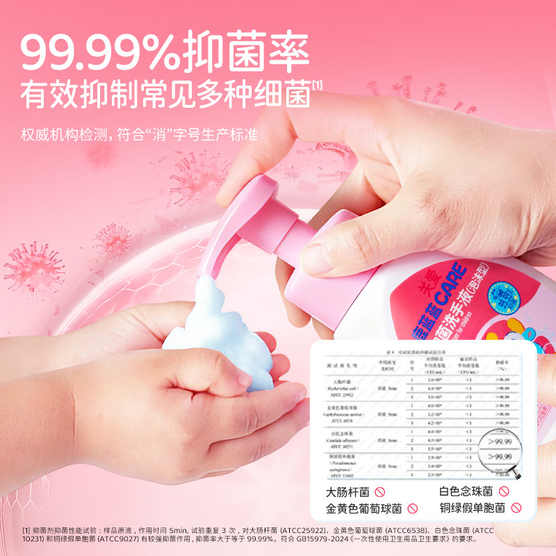 【小鹿蓝蓝CARE_儿童抑菌变色泡沫洗手液】专为宝宝娇嫩肌肤设计,蕴含温和抑菌成分,有效抵御常见细菌,守护孩子健康。独特桃香配方,清新怡人,让孩子爱上洗手。按压即出绵密泡沫,无需揉搓起泡,轻松清洁小手,减少刺激。创新变色科技,泡沫由蓝变白,直观提示洗手时长,帮助孩子养成正确洗手习惯。pH值接近肌肤,无泪配方,不含酒精、香精等刺激成分,洗后不干燥,呵护宝宝柔嫩双手。适合全家日常使用,是家庭健康护理的贴心之选。让每一次洗手,都成为充满乐趣的卫生启蒙时刻。