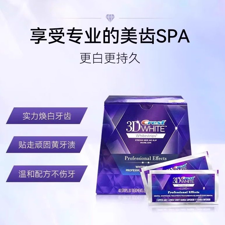 【百补】佳洁士美白牙贴(美版)采用先进3D贴合技术,专为去黄亮白设计,40贴装长效护理,轻松实现居家专业级美白体验。产品源自美国原装进口,正品保障,含温和有效美白成分,深入牙渍层分解色素,不伤牙釉质。独特锁白科技,美白效果持久,使用后牙齿自然亮白,笑容更自信。贴合度高,佩戴舒适,每日30分钟,连续使用可见明显变化。适合长期咖啡、茶、烟渍导致的牙齿泛黄人群。安全无刺激,经牙医推荐,是追求洁白笑容的理想之选。坚持使用,绽放迷人炫白光彩。