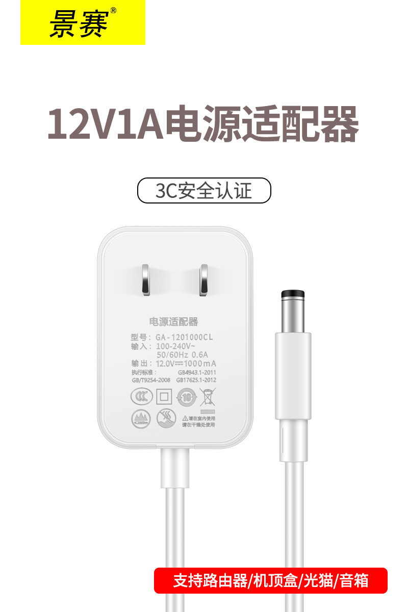 景赛12V1A电源适配器是一款通用型直流电源设备,适用于多种家用电子产品。其输出为12V/1A,兼容性强,广泛用于电信机顶盒、宽带光猫、天猫精灵、小度音响、华为路由器、智能音箱、LED台灯等设备。采用优质材料制造,具备过压、过流、短路等多重安全保护,确保使用稳定可靠。插头规格为标准5.5×2.1mm,线长适中,方便布线。产品通过国家3C认证,安全耐用,是替代原装充电器的理想选择。无论是家庭日常使用还是设备备用电源,景赛12V1A电源适配器都能提供持续稳定的电力支持,性价比高,广受用户信赖。