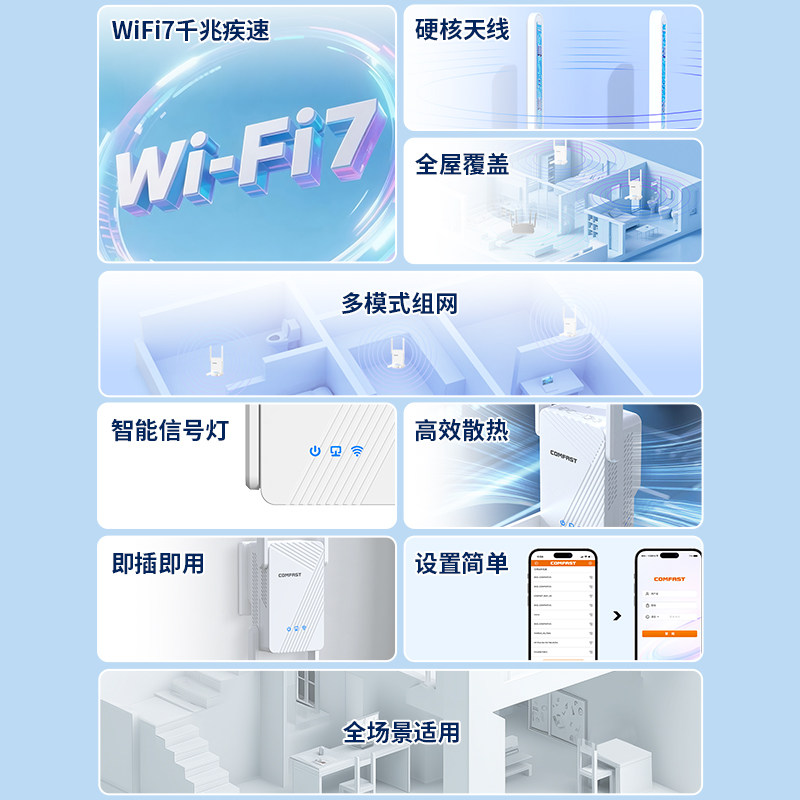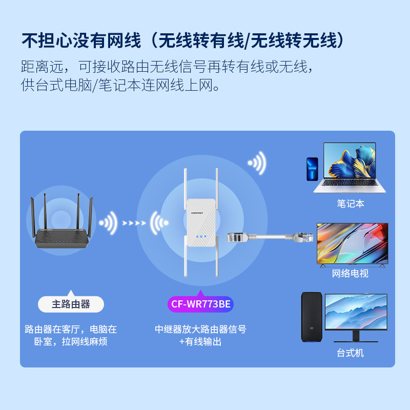 天猫COMFAST中继器wifi信号增强放大器中继5G双频WiFi7路由扩展千兆网口AP网络扩大家用房间卧室信号增强cf-773