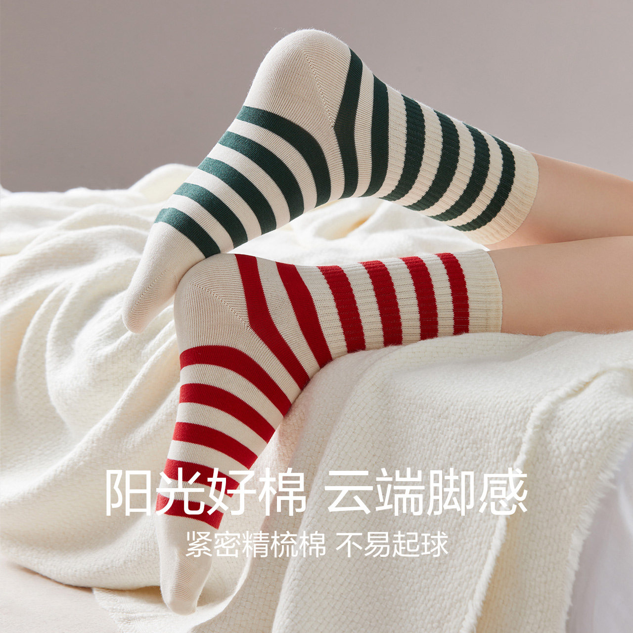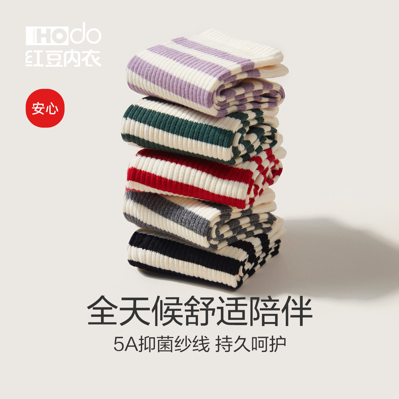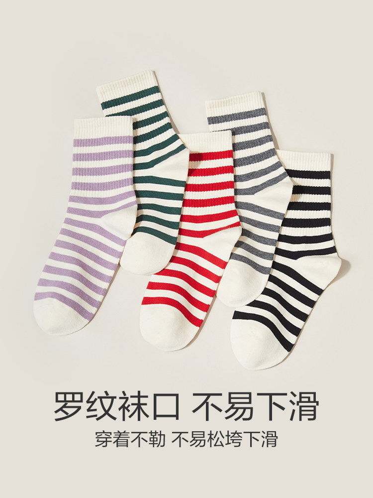 天猫女士精梳棉袜条纹中筒袜抗菌彩色条纹百搭长袜休闲无骨袜子5双装