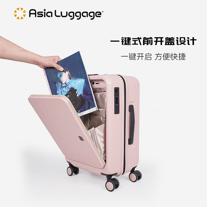 AsiaLuggage日本OneTouch前开盖电脑袋行李箱集实用与便捷于一体,专为商旅人士设计。采用高强度PC+ABS材质,轻盈抗冲击,搭配TSA海关锁,安全无忧。独特前开盖设计,一键开启即可快速取放笔记本电脑、文件等物品,安检更高效。内置独立电脑隔层,适配15.6英寸笔记本,保护周全。360°万向静音轮顺滑耐磨,推拉安静省力;多段式铝合金拉杆,稳固耐用。箱体线条简约大气,多色可选,兼顾商务与时尚。无论是出差还是短途旅行,AsiaLuggage OneTouch都能为您提供从容便捷的出行体验。