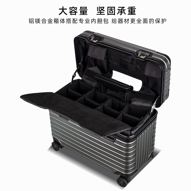 这款金属铝镁合金摄影拉杆箱集坚固、轻便与多功能于一体,专为摄影师和旅行者设计。采用高强度铝镁合金材质,箱体抗冲击、防腐蚀,有效保护内部相机、镜头等贵重器材。内部配备可调节EVA防震内衬,精准固定设备,避免运输途中碰撞。360°静音万向轮搭配稳固拉杆,推行顺滑省力,适合机场、户外等多种场景。紧凑尺寸符合登机标准,男女通用,兼顾专业与时尚。无论是旅行拍摄还是日常通勤,它都是可靠的移动工具箱,为摄影装备提供全方位防护,是摄影师出行不可或缺的伴侣。