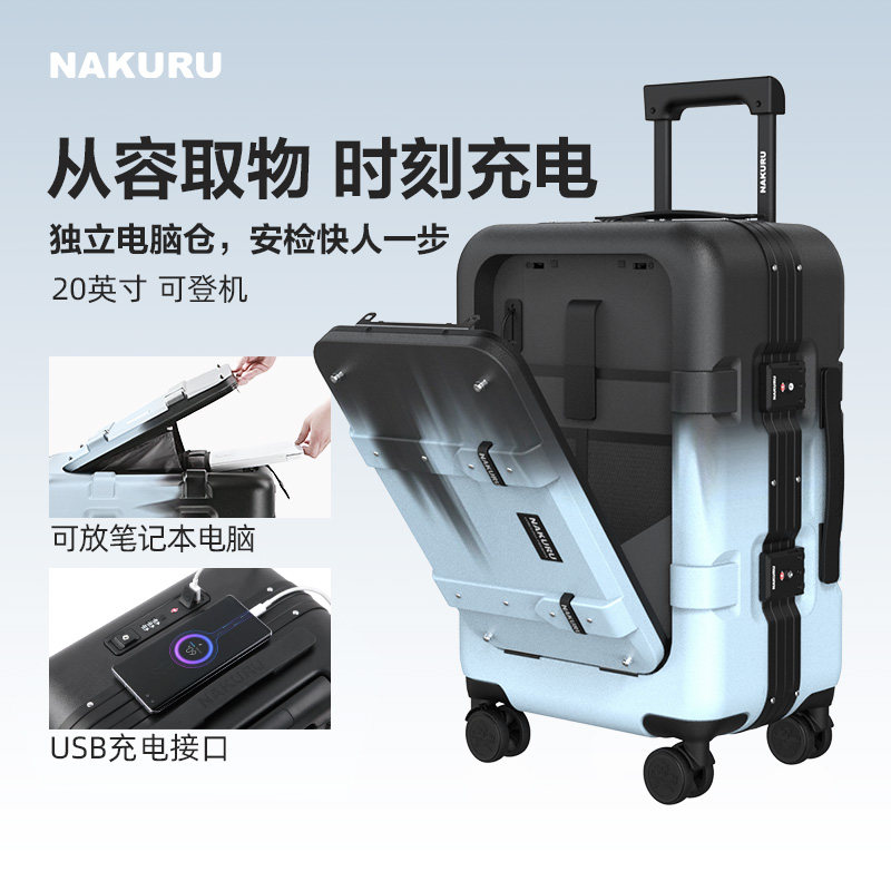 NAKURU新款20寸前开盖行李箱,集时尚设计与实用功能于一体,专为商务人士及旅行爱好者打造。采用高强度铝框结构,坚固耐用,有效保护箱内物品。创新前开盖设计,无需取出即可快速取放文件、电脑等随身物品,极大提升登机效率。配备TSA海关密码锁,安全便捷,全球通关无忧。轻盈PC材质结合静音万向轮,推拉顺滑,久行不累。内部布局合理,多隔层收纳,满足男女不同出行需求。简约大气的外观,适配多种场合,是商务出行与短途旅行的理想伴侣。