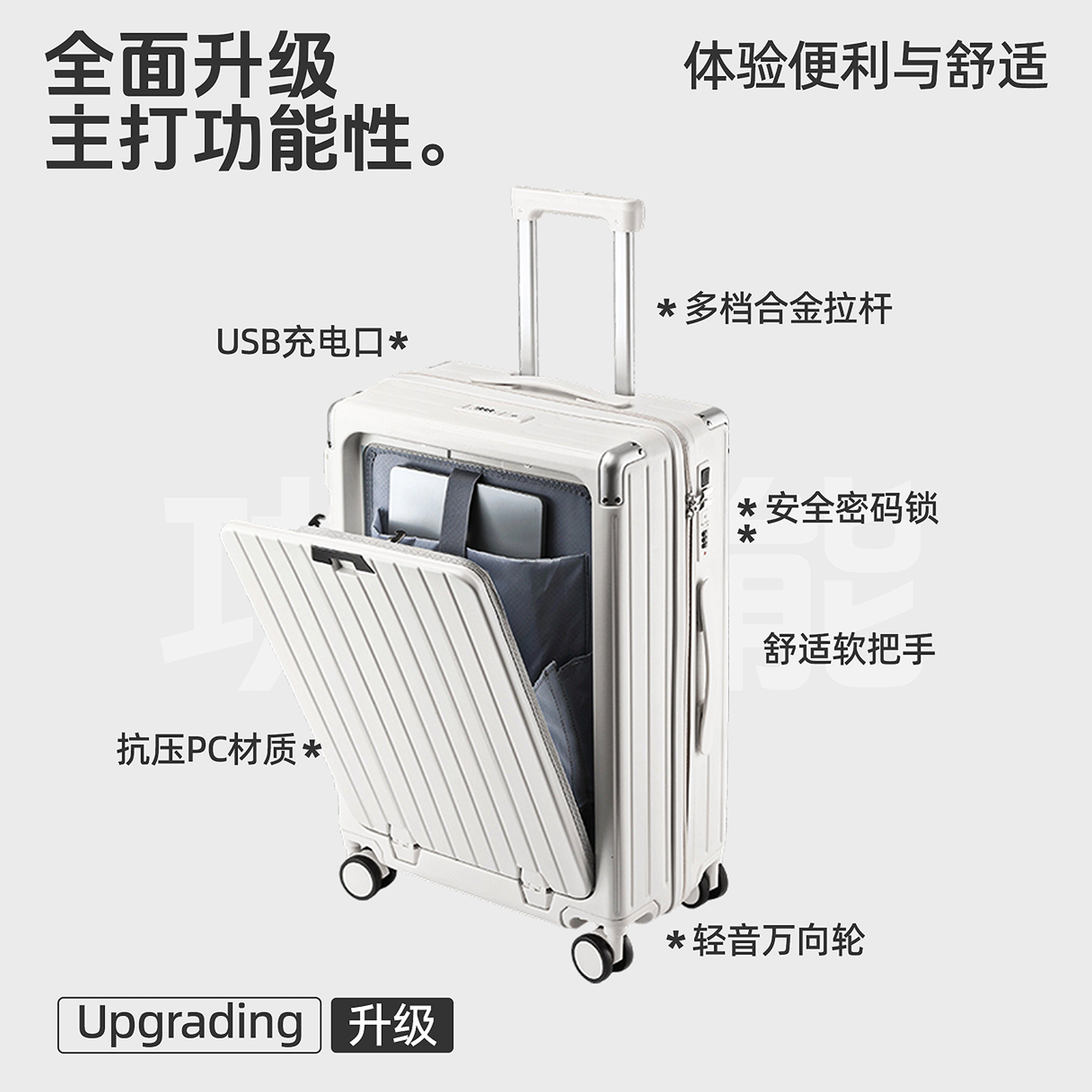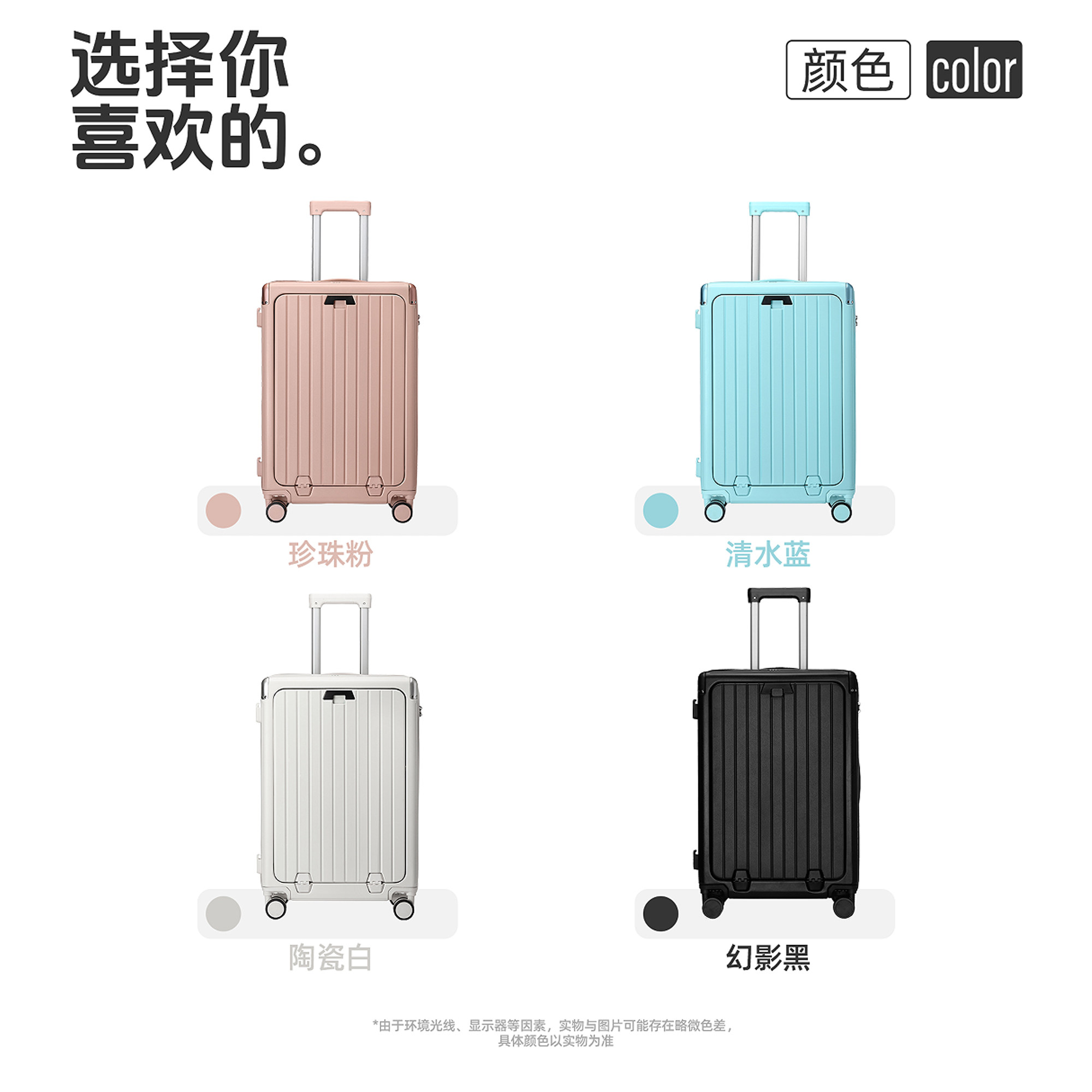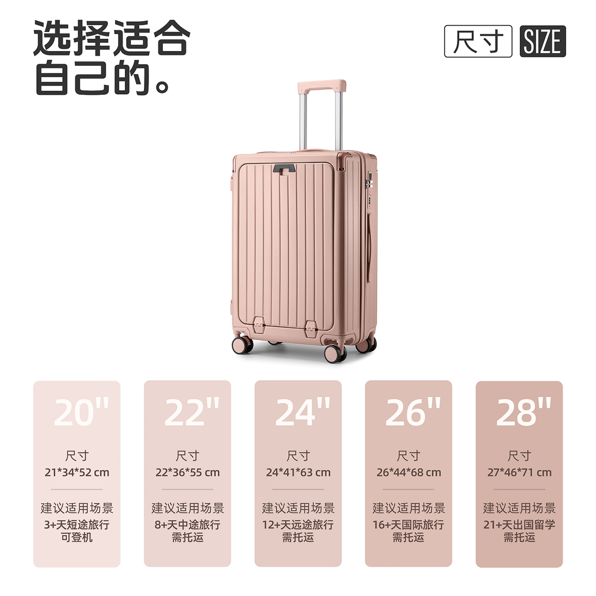 2025年新款20寸小型登机箱,专为现代旅行者设计,轻便耐用,符合主流航空公司登机标准。采用高强度PC材质,抗冲击性强,表面防刮耐磨。创新前开口设计,无需取出行李即可快速取放物品,安检更便捷。配备TSA海关密码锁,安全放心;360°静音万向轮,推拉顺滑省力;多隔层收纳系统,轻松分类整理。同时推出24寸扩容款,满足长途出行需求。拉杆为铝合金材质,四档调节,稳固不晃动。集时尚外观与实用功能于一体,是商务、旅行、留学的理想伴侣。