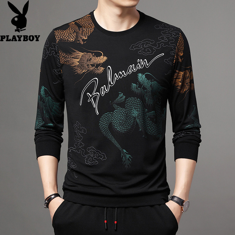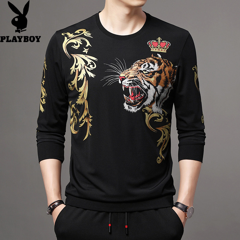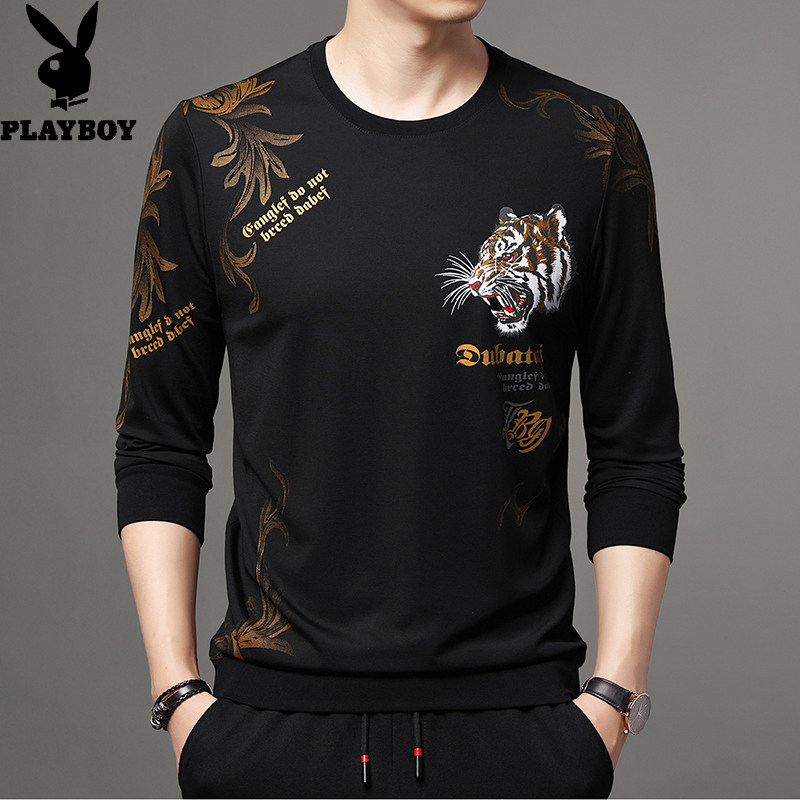 淘宝花花公子卫衣男春秋圆领长袖t恤中青年印花纯棉薄款上衣服打底衫