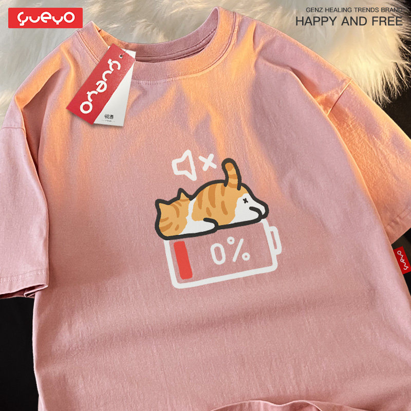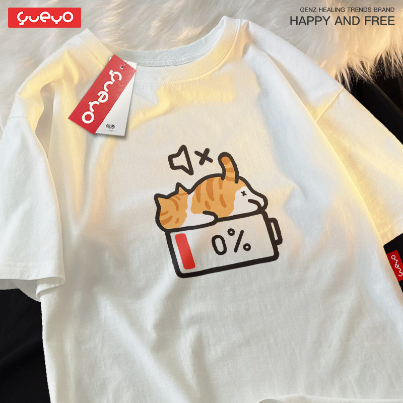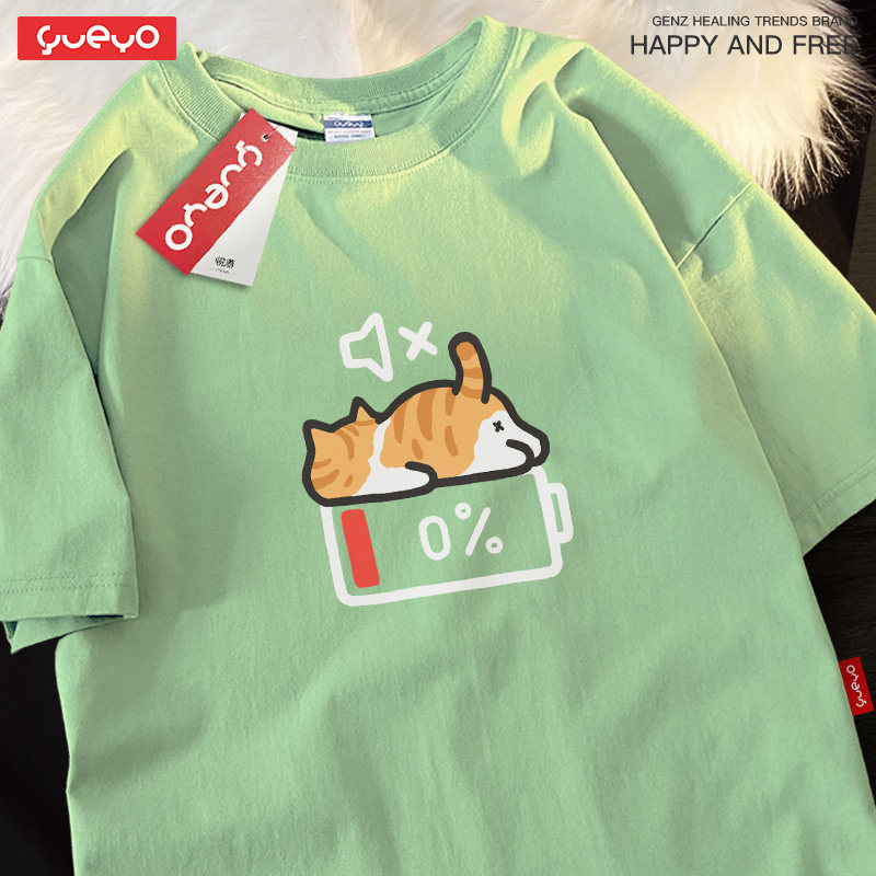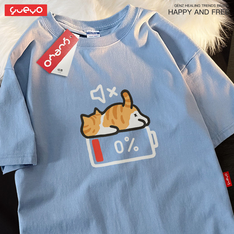 天猫悦游 没电橘猫 纯棉宽松落肩短袖T恤男夏季原创潮牌橘猫疲劳累趴