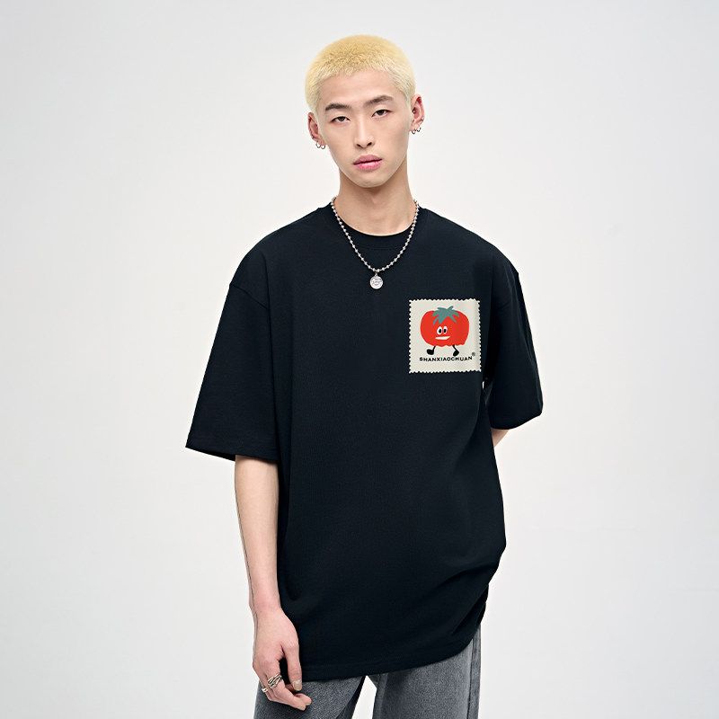 淘宝山小川潮牌西红柿印花重磅纯棉短袖t恤男女款美式夏季宽松情侣装