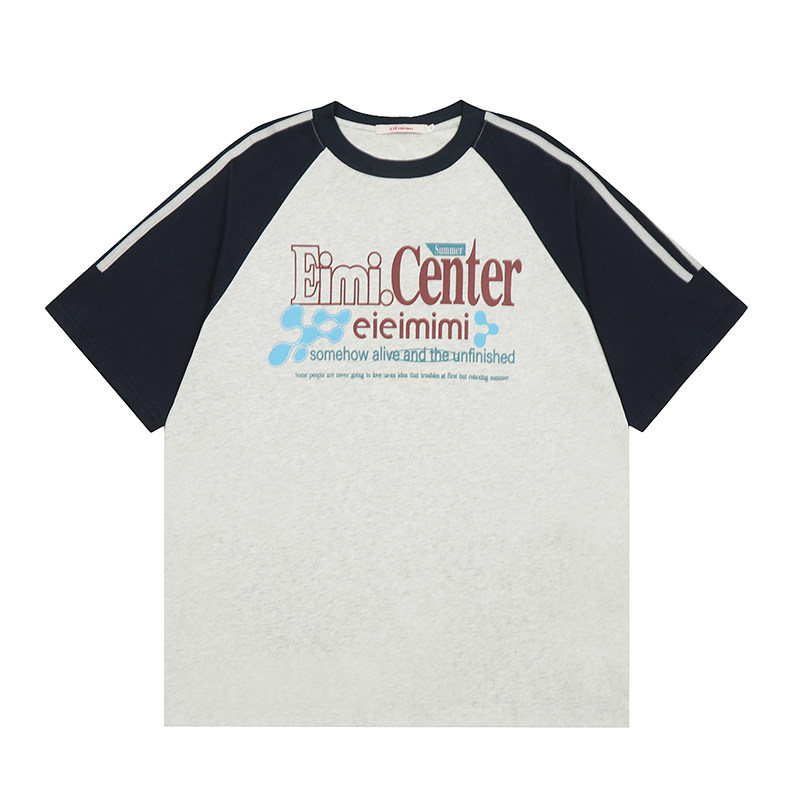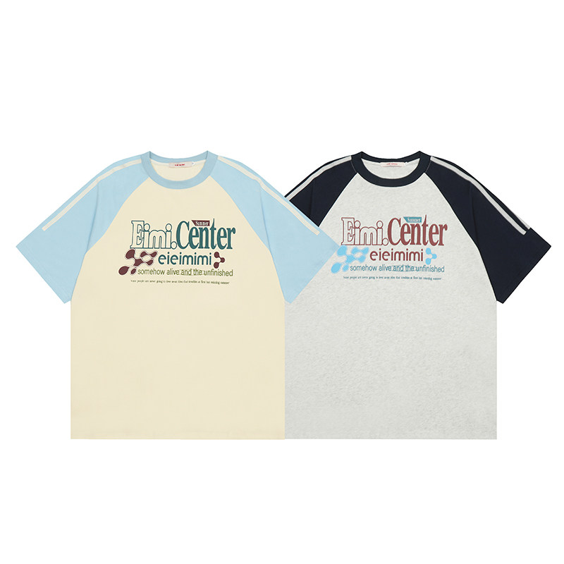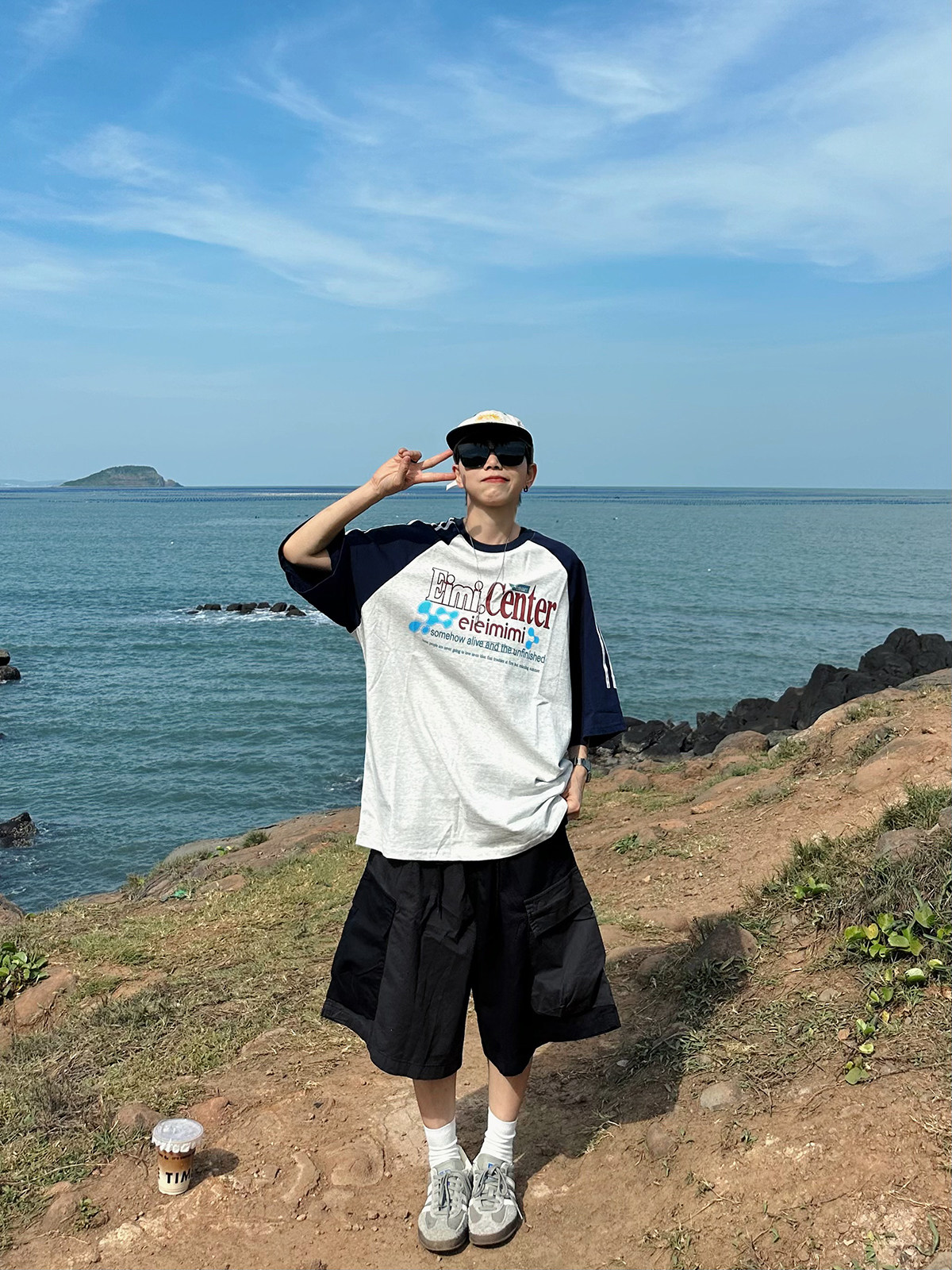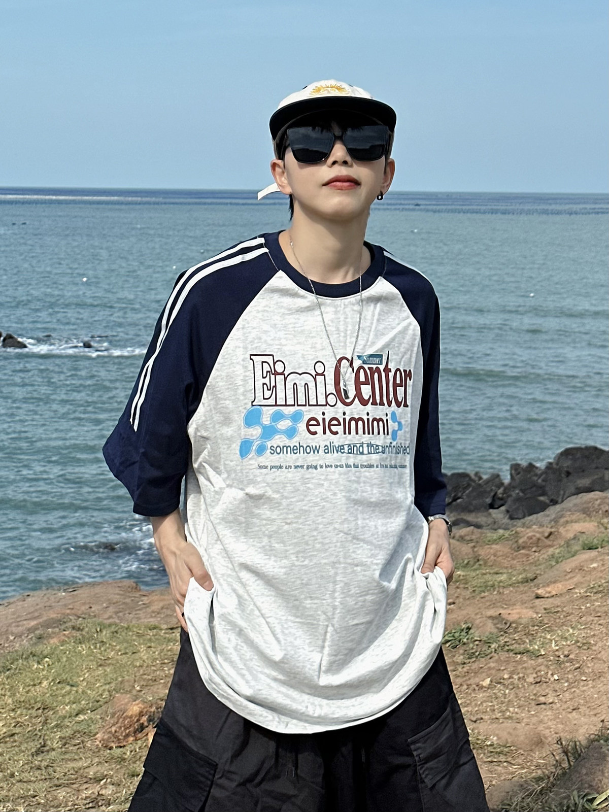 淘宝XBRO美式复古夏季撞色印花插肩袖宽松落肩五分袖T恤男女拼接上衣