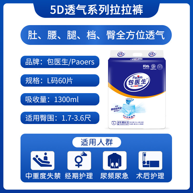 包医生成人拉拉裤是一款专为成人设计的一次性内裤型纸尿裤,适用于老人、孕妇及行动不便人群,男女通用。L号设计贴合身形,提供舒适包裹感,60片装满足日常护理需求。采用高吸收芯体,快速锁水防漏,保持肌肤干爽,减少红疹风险。立体防漏隔边有效防止侧漏,贴身更安心。弹性腰围设计,穿脱便捷,如内裤般轻松,提升使用者尊严与舒适度。外层柔软亲肤,透气性佳,长时间使用也不闷热。包医生品牌专注成人护理,品质可靠,是家庭照护的理想选择,让护理更省心,生活更自在。