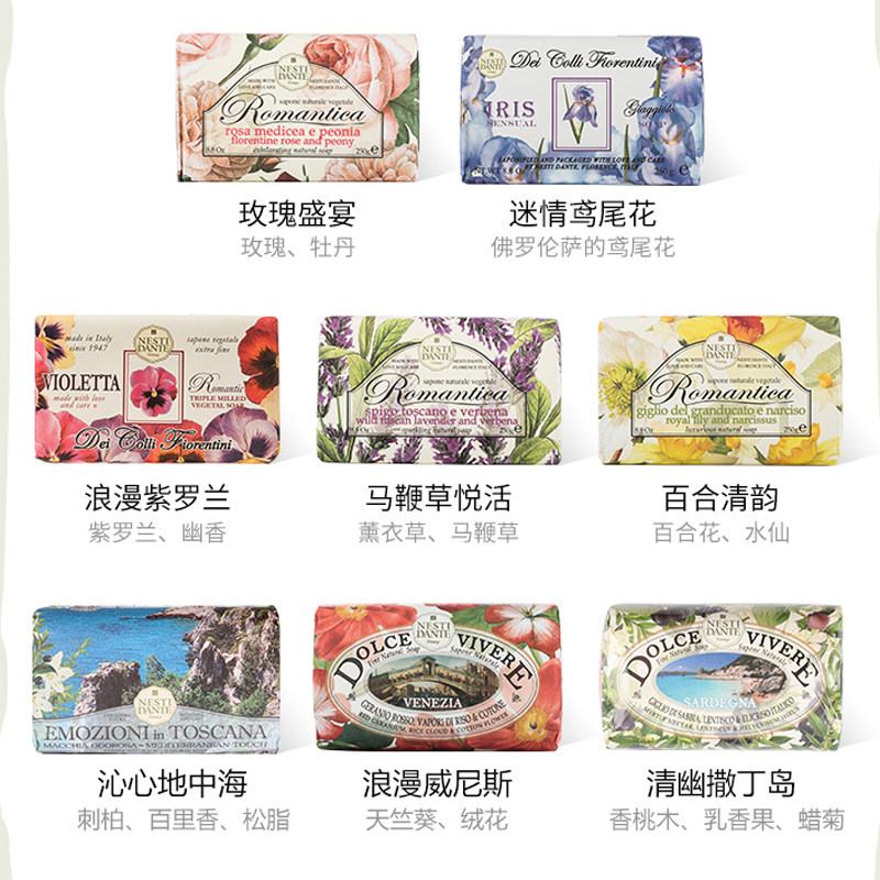 NestiDante(内斯蒂丹特)是意大利知名手工香皂品牌,源自佛罗伦萨,拥有百年传承工艺。其手工精油皂采用天然植物油脂与珍贵精油精心调制,不含人工色素与防腐剂,温和洁净肌肤。产品融合橄榄油、乳木果油及薰衣草、佛手柑等天然精油,兼具洗脸、洗澡、沐浴等多重功效,适合全家人使用。细腻的泡沫深入清洁毛孔,同时滋养保湿,令肌肤柔滑细腻。每块香皂均为手工切割与包装,体现意式匠心美学。NestiDante不仅是一款洗护产品,更是一种源自地中海的生活方式,带来自然、纯净的沐浴体验。