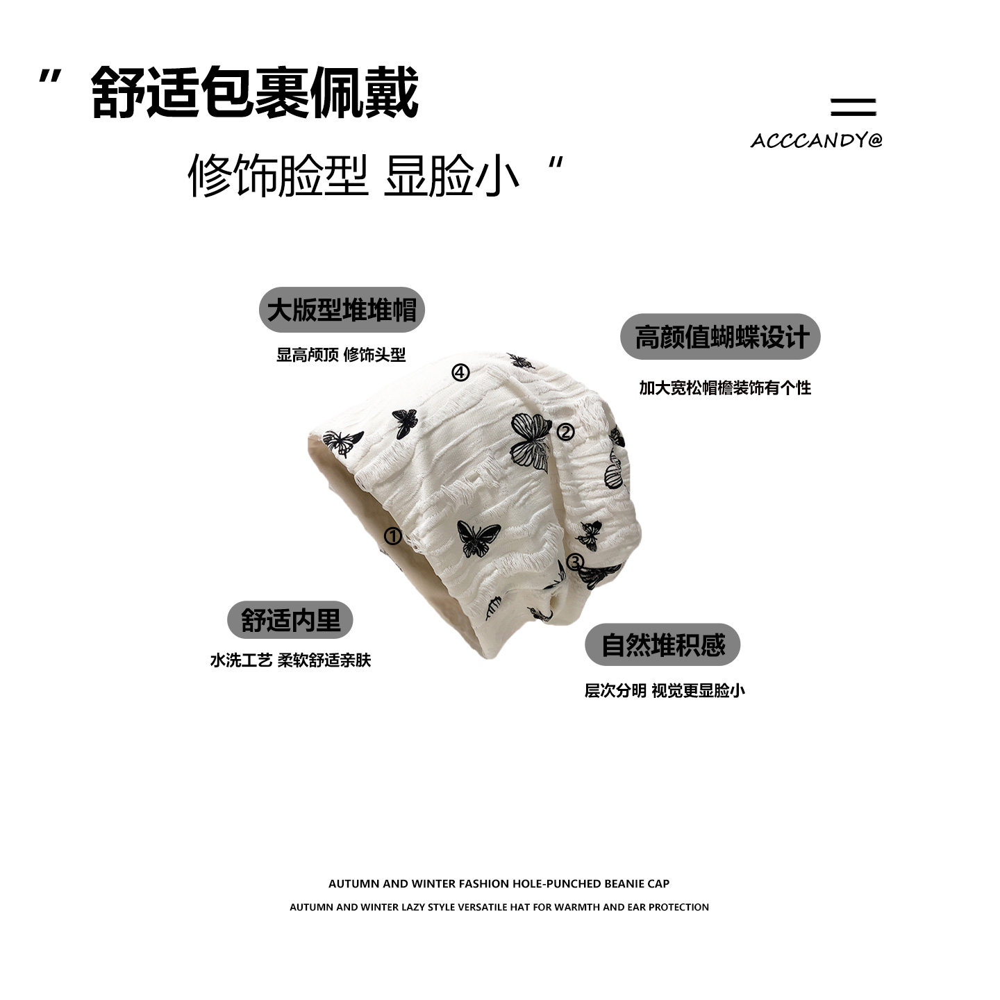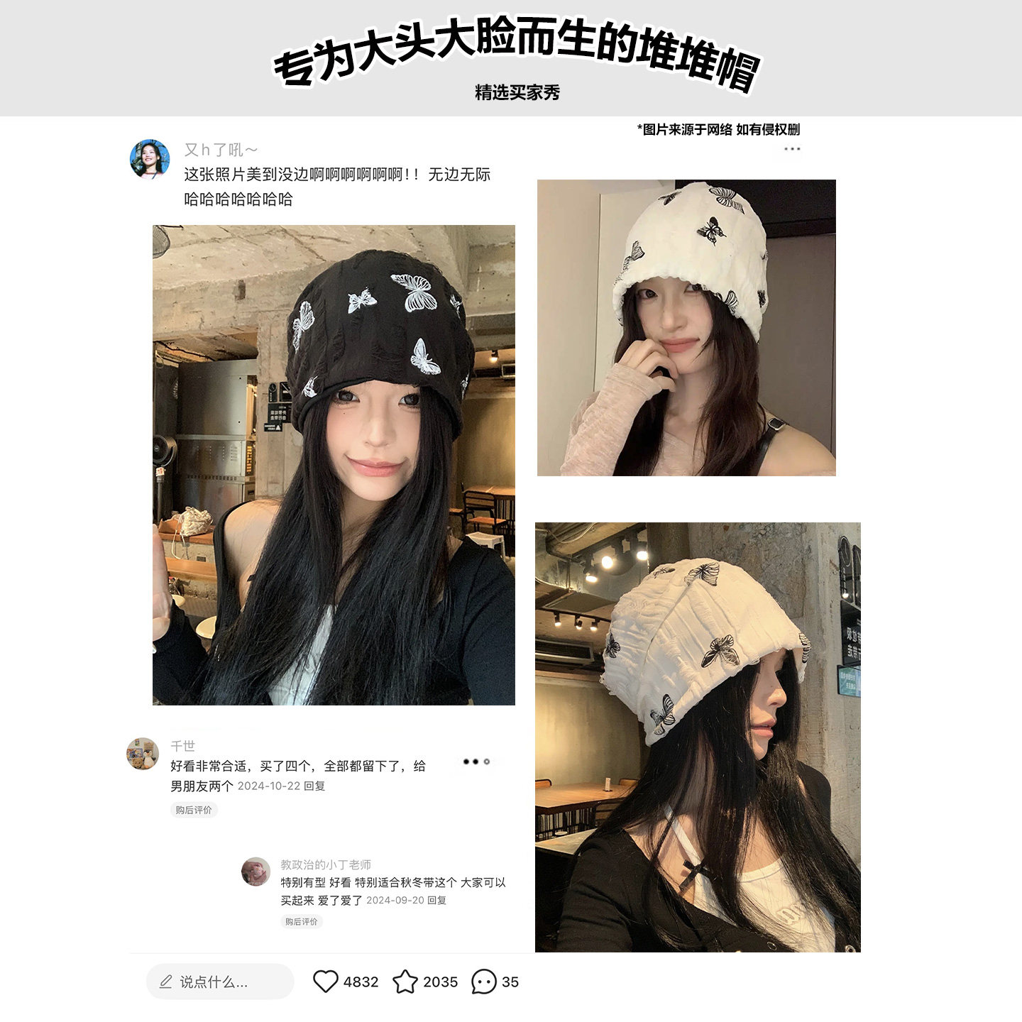 淘宝小众设计蝴蝶刺绣大头围包头堆堆帽女春秋显脸小冷帽孕妇月子帽