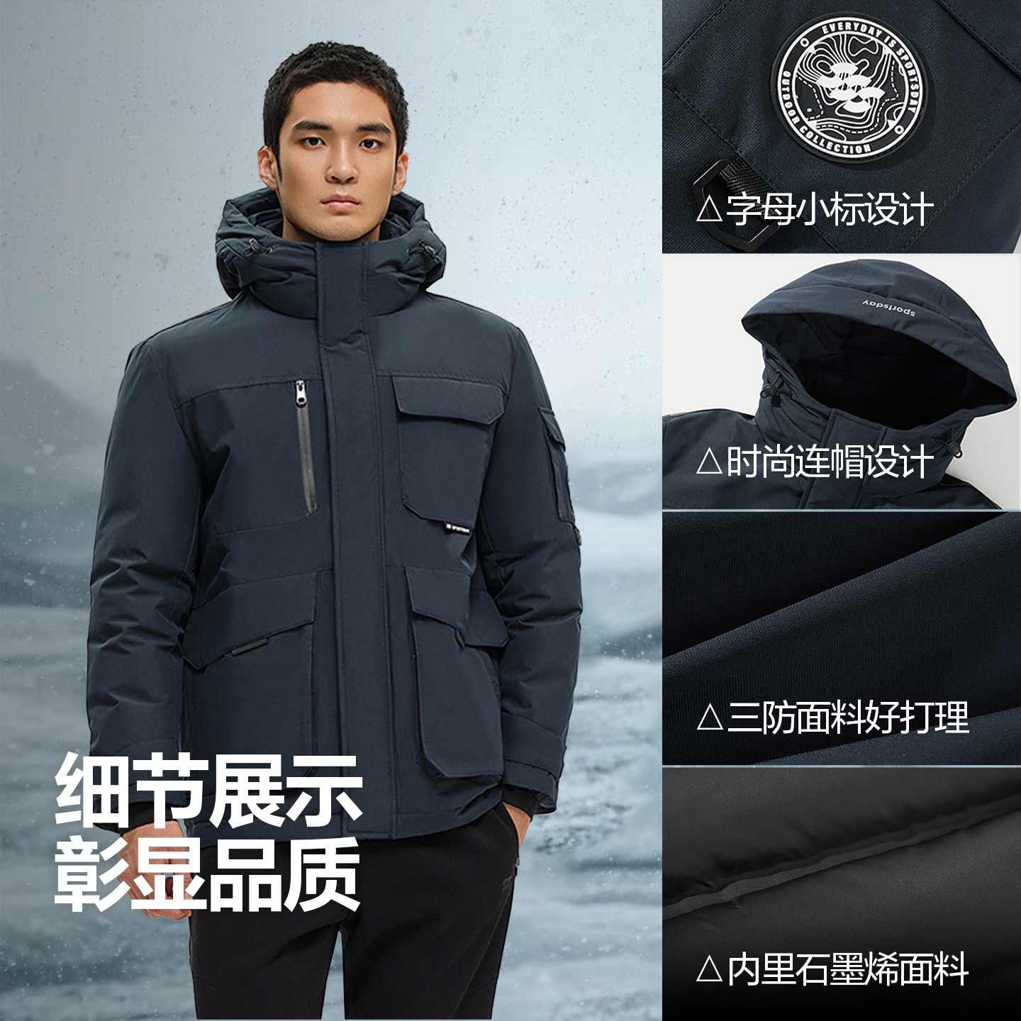 淘冬季新款男士高端字母印花加厚连帽鸭绒羽绒服潮牌工装保暖外套潮