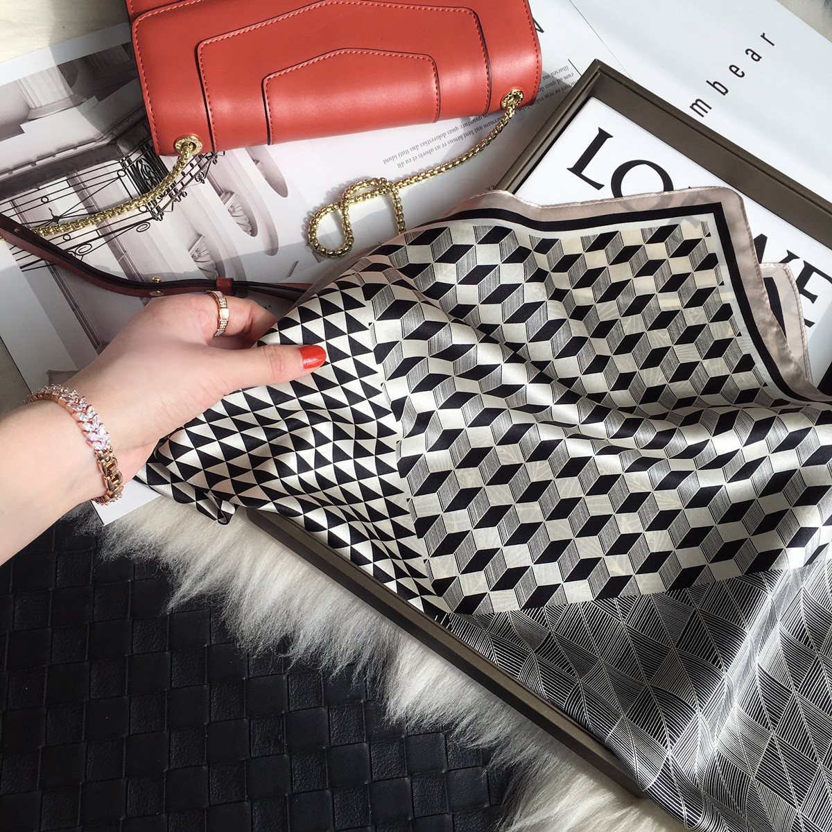 淘宝小溜家围巾桑蚕丝真丝丝巾春秋百搭几何拼接小领巾装饰53cm小方巾