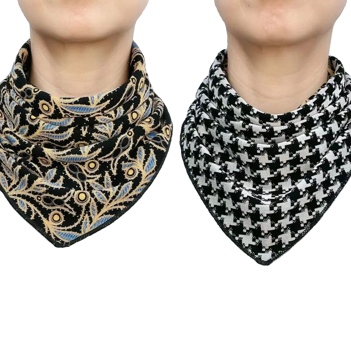 2023新款双面三角巾围巾,集时尚与实用于一体,专为秋冬季节设计。采用高品质亲肤面料,双面可戴,一面优雅印花,一面纯色简约,轻松应对不同穿搭风格。创新按扣设计,穿脱便捷,稳固贴合颈部,兼具护颈保暖与装饰功能。可作为假领子提升层次感,亦可作脖套抵御寒风,百搭大衣、毛衣、风衣等单品。轻便易携带,不占空间,是女性日常通勤、出行旅行的理想配饰。无论是职场还是休闲场合,都能展现精致气质,是秋冬衣橱不可或缺的时尚单品。