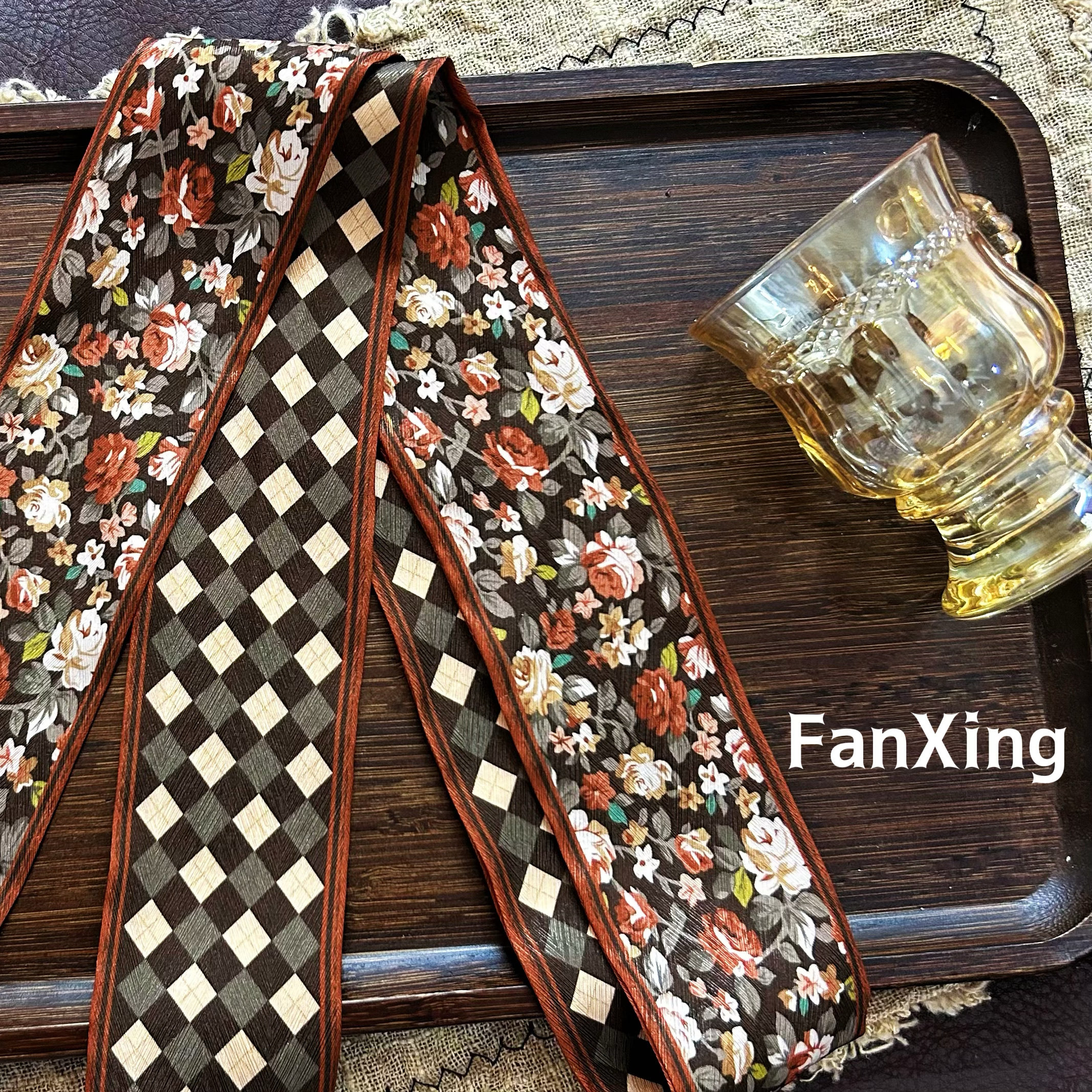 淘新款韩版咖色系丝巾发带女小长条薄款涤纶花朵头饰小众飘带千鸟格