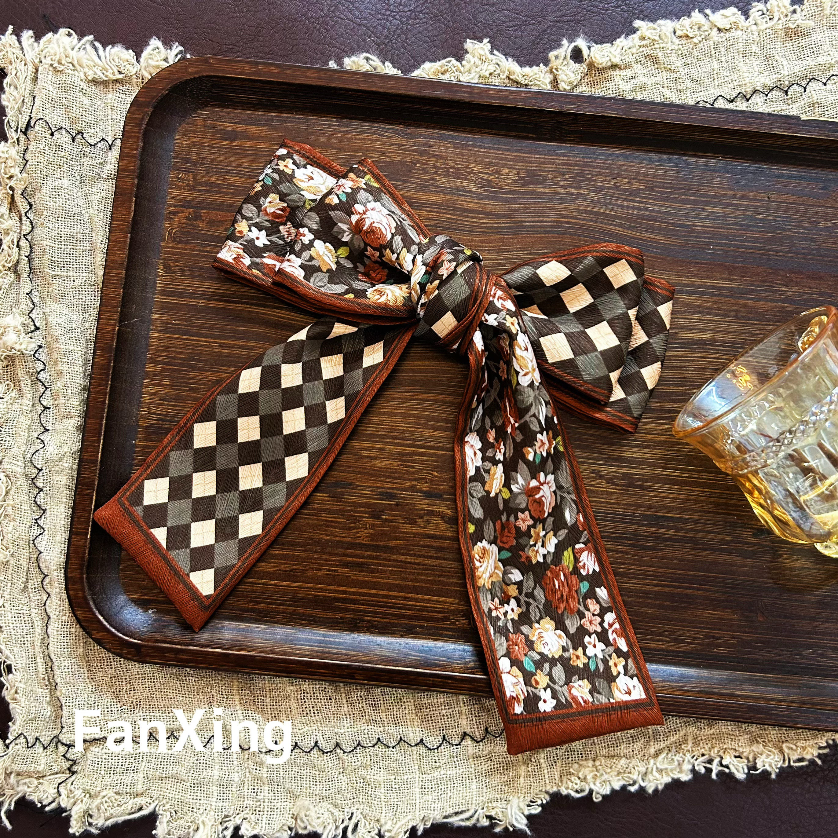 新款韩版咖色系丝巾发带女小长条薄款涤纶花朵头饰小众飘带千鸟格