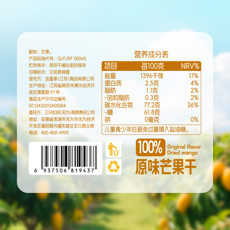 三只松鼠原味芒果干,精选优质玉娇芒,采用传统蜜饯工艺,0添加防腐剂、人工色素与香精,保留芒果天然果香与柔韧口感。果肉厚实,酸甜适中,每一口都充满阳光滋味,是解馋又健康的理想选择。独立小包装设计,方便携带,无论是办公室下午茶、午后小憩,还是旅途零食,都能随时享受美味。无负担的配方让大人孩子都安心食用。三只松鼠坚持严选食材,用心打造每一份健康零食,让美味与健康兼得。原味芒果干,不仅是味蕾的享受,更是对品质生活的追求,是日常休闲时光的贴心伴侣。