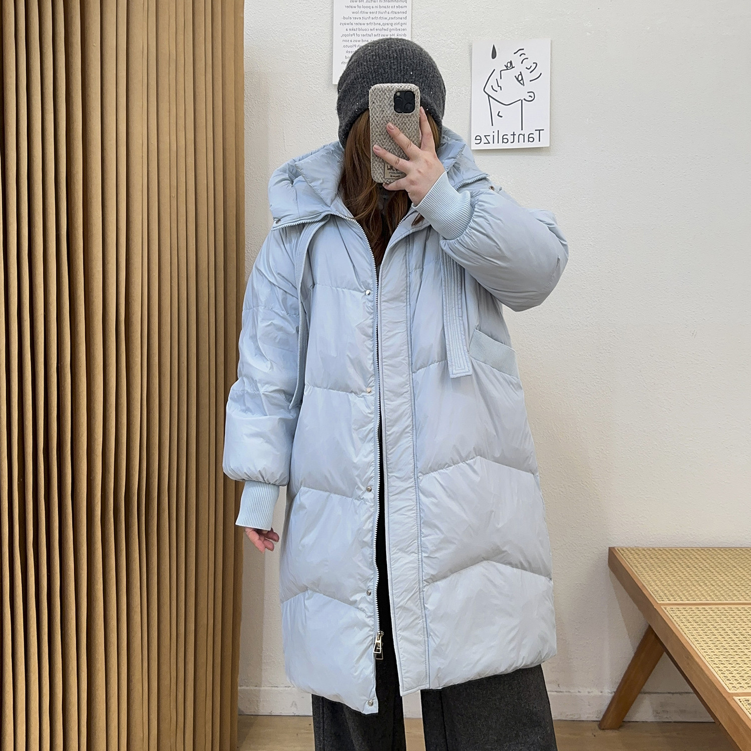 90白鸭绒中长款纯色百搭连帽外套女冬2025新款超好看保暖羽绒服潮