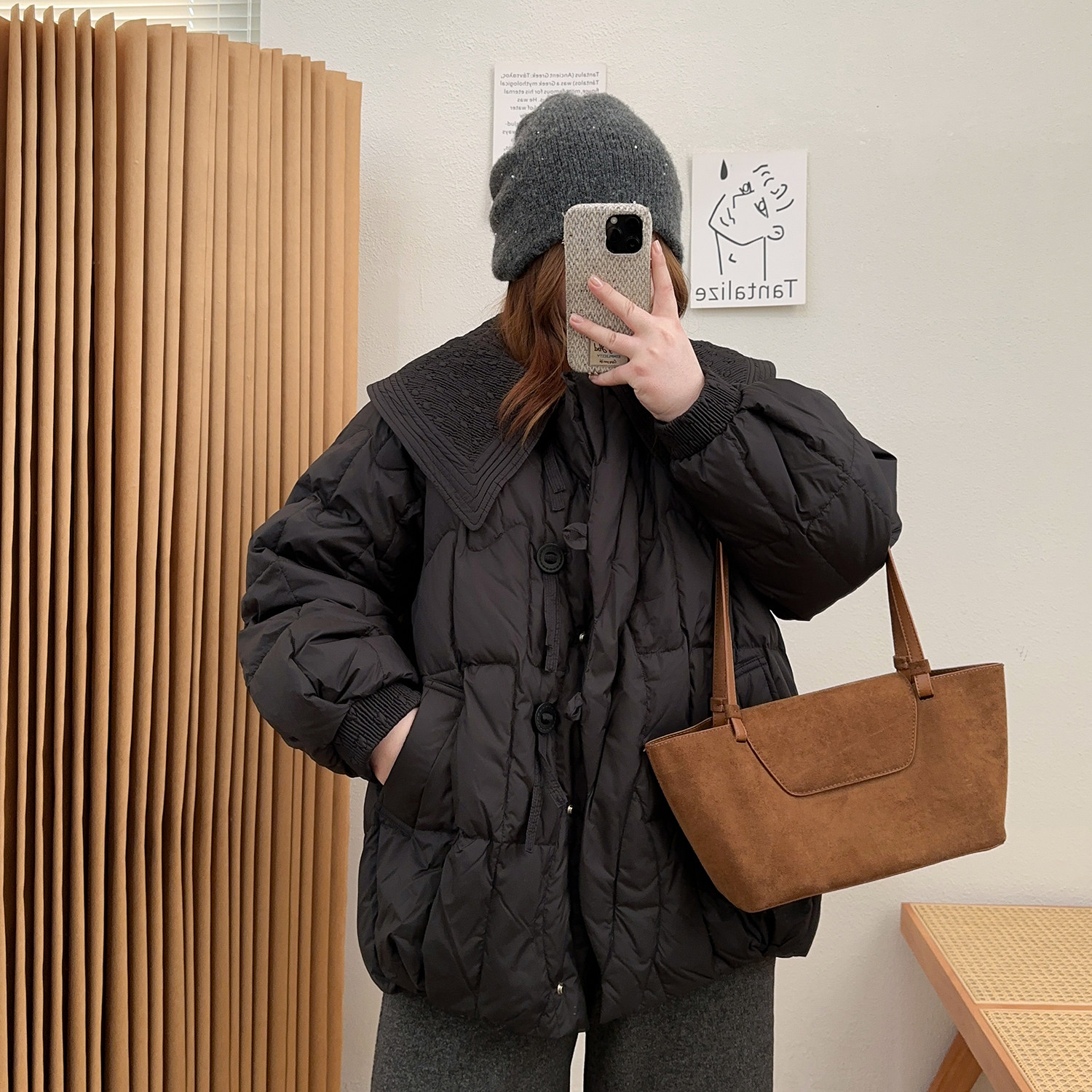 宛宛大码女装冬季新款可爱娃娃领羽绒服,专为200斤以内的胖MM设计,兼顾保暖与时尚。采用优质白鸭绒填充,蓬松轻盈,锁温效果出众,轻松应对寒冷天气。宽松版型包容性强,巧妙修饰身形,不显臃肿。甜美娃娃领设计俏皮减龄,增添少女感,搭配精致走线与实用口袋,细节满分。多色可选,百搭易穿,无论是日常通勤还是休闲出行都能轻松驾驭。宛宛大码致力于为微胖女性打造自信穿搭,让每一位女性都能在冬日里温暖又美丽,展现独特魅力。