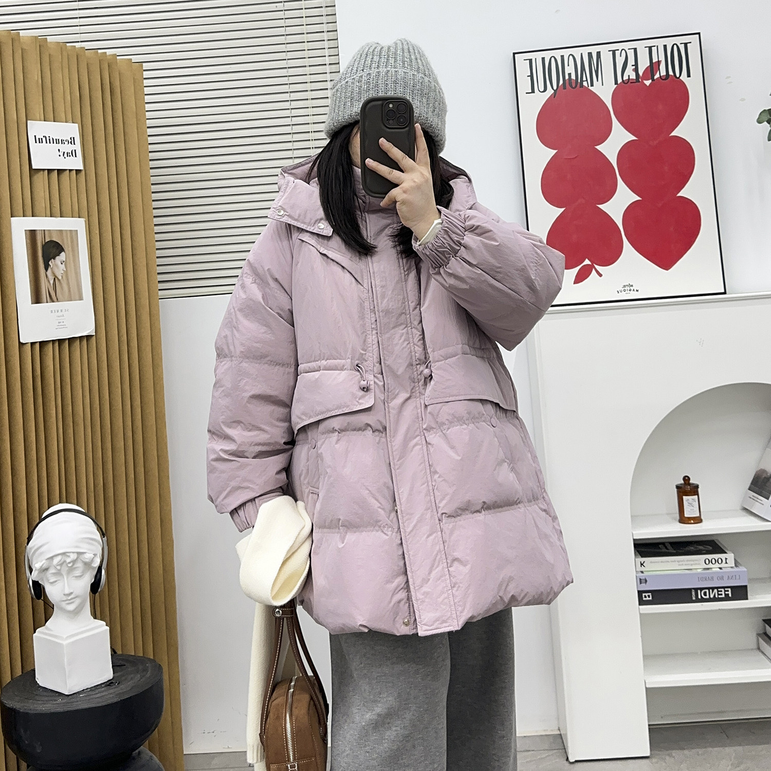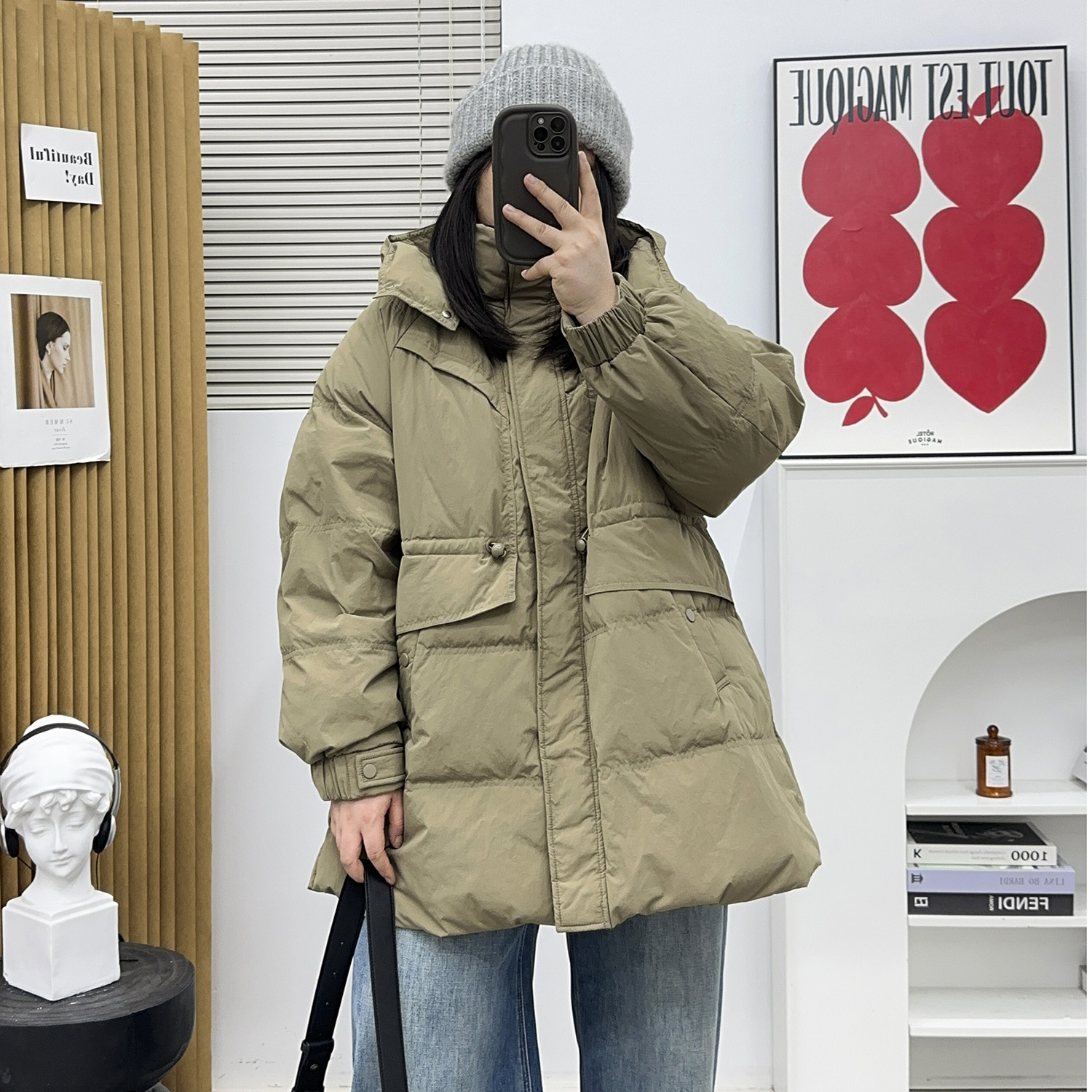 90白鸭绒中长款纯色百搭连帽外套女冬2025新款超好看保暖羽绒服潮