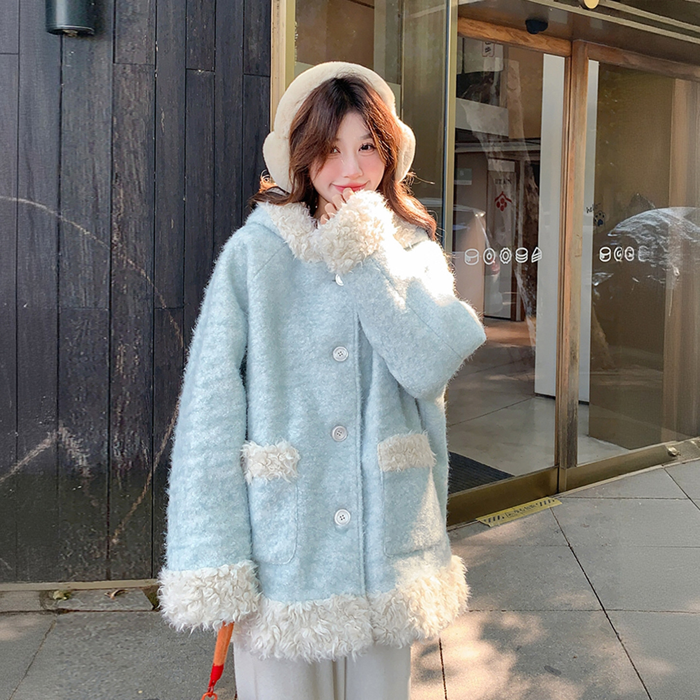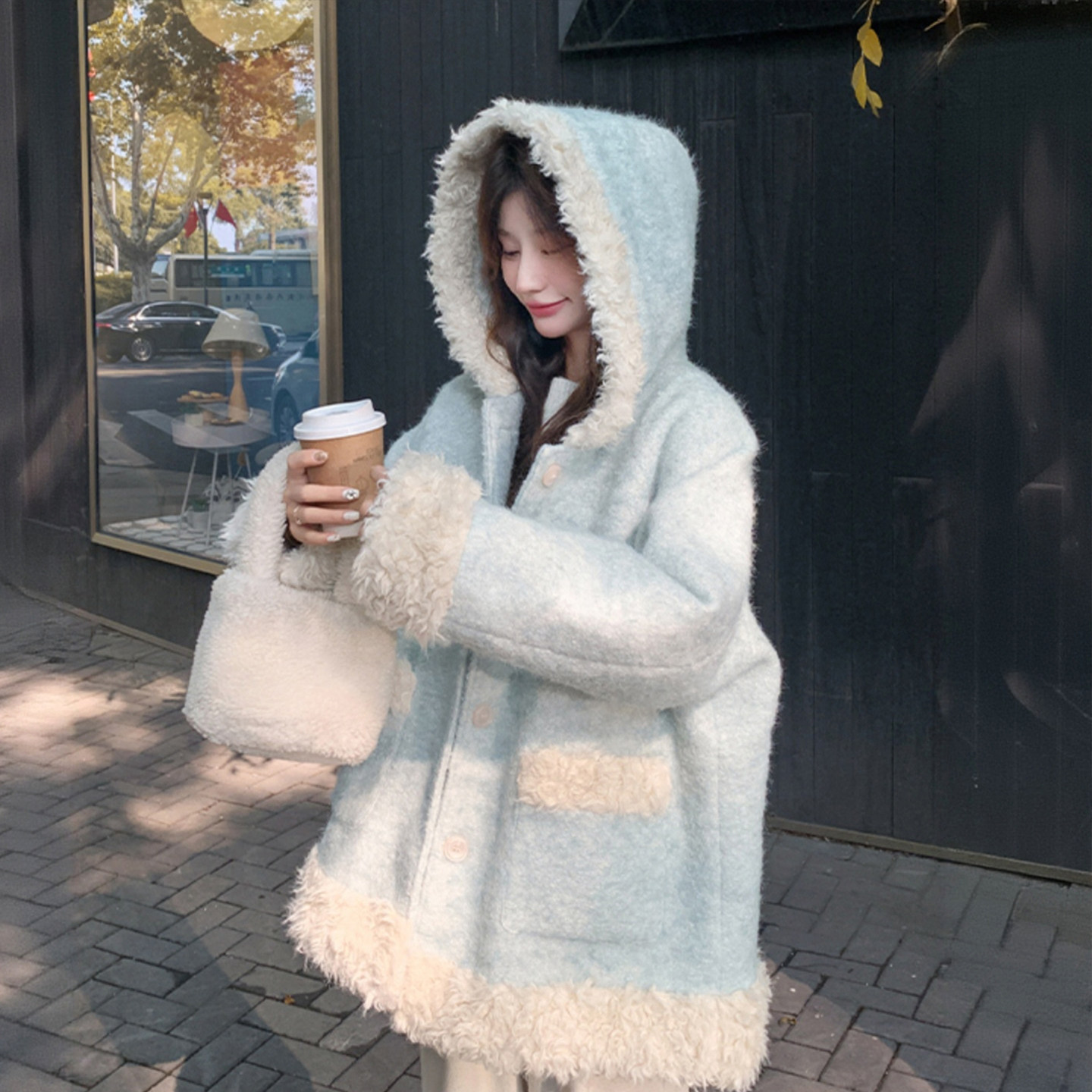 淘宝300斤大码女装蓝色连帽毛呢外套女秋冬胖mm保暖加厚羊羔毛呢大衣