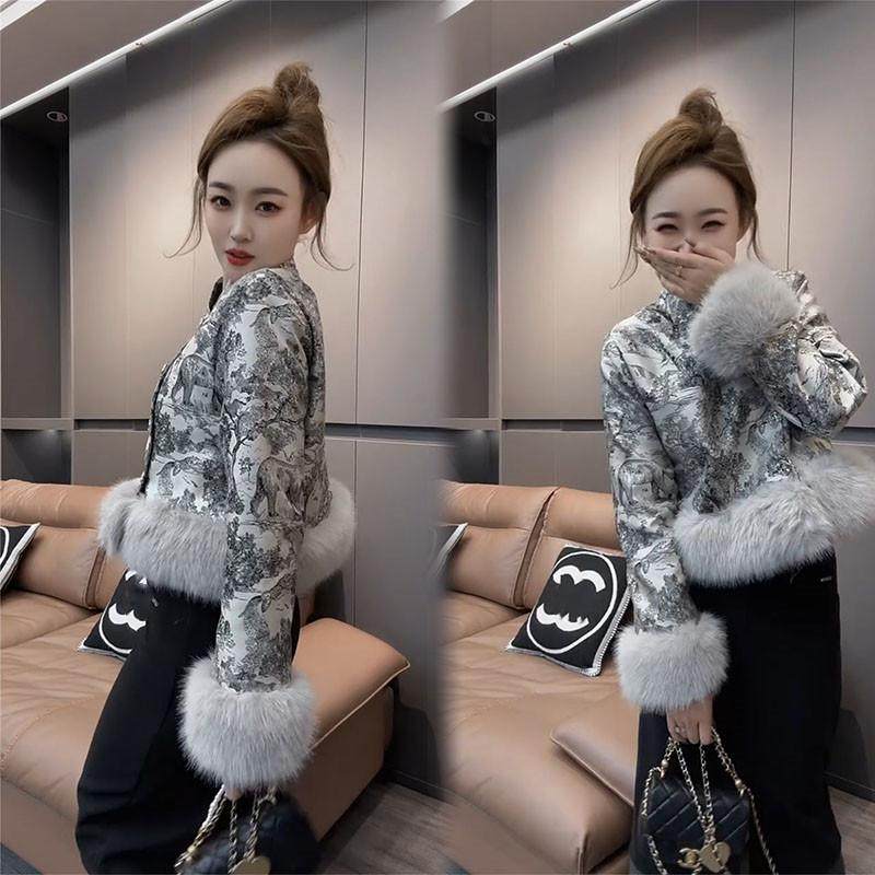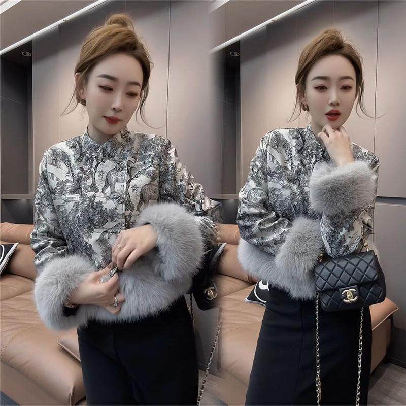 淘宝水墨画外套女新中式国风立领盘扣毛毛袖外套复古爆款印花上衣女士