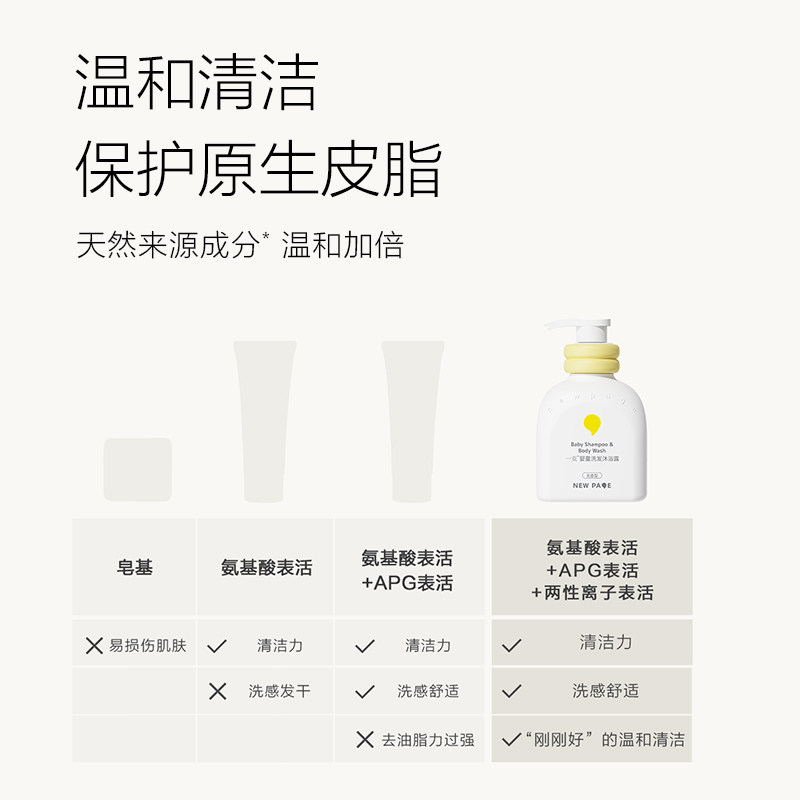 【百补】newpage一页婴童沐浴露洗发水洗沐二合一,专为婴幼儿娇嫩肌肤研发,温和无泪配方,洗护同步更便捷。采用天然植物精粹,低敏亲肤,有效清洁同时呵护宝宝皮脂屏障,避免干燥敏感。pH值贴近肌肤天然弱酸性,温柔不刺激,入眼亦不刺痛,让宝宝沐浴更安心。泡沫细腻丰富,易冲洗无残留,洗后肌肤柔滑、发丝清爽。无添加香精、色素、皂基及有害防腐剂,通过多项安全检测,妈妈更放心。适用于新生儿及敏感肌宝宝,是日常洗护的理想之选,让每一次沐浴都成为亲子间的温柔时光。