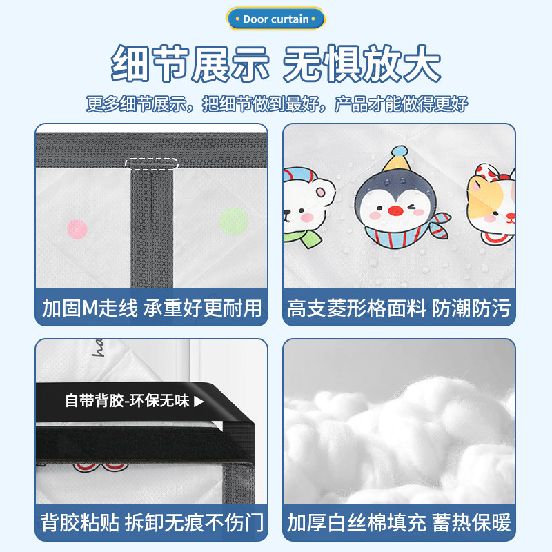 冬季加厚棉门帘,专为寒冷季节设计,采用高密度填充棉与防风外层,有效阻隔冷空气侵入,提升室内保暖效果。磁吸式闭合设计,开合顺畅且密封性强,关门后自动吸附,防止缝隙漏风。适用于卧室、阳台、厨房等门口,兼具隔音、保温、防寒功能,营造温暖安静的居家环境。外层防水防污,内里柔软亲肤,耐用易清洁。安装简便,无需打孔,挂钩或粘贴即可固定。不仅实用性强,外观简约大方,适配多种家居风格,是冬季防寒的理想选择,让家更温暖舒适。