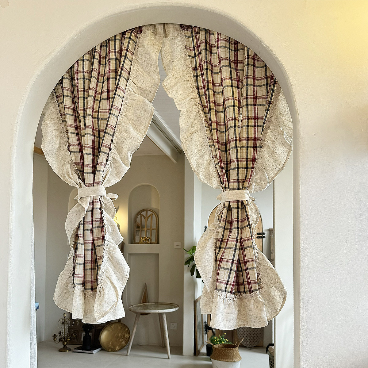 格子森林普罗斯旺乡村美式毛球半帘门帘免打孔穿杆蝴蝶结窗帘清新