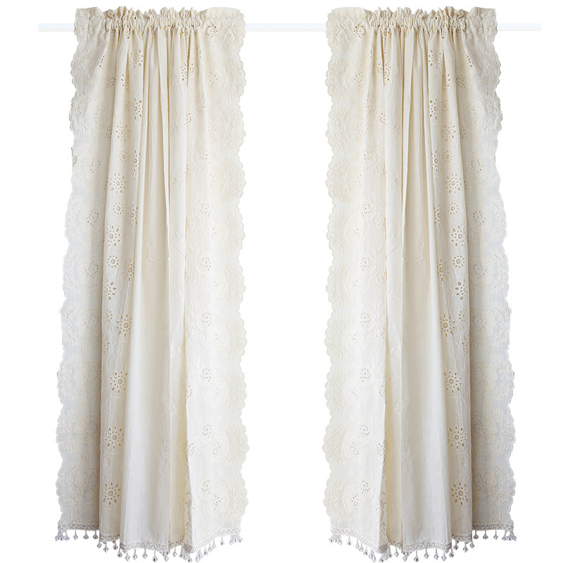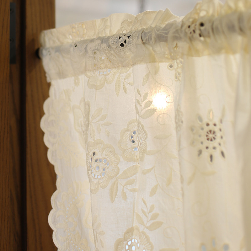 淘鸢尾乡旅米色蕾丝半帘宫廷圆环绣窗帘门帘美式穿杆免打孔咖啡帘