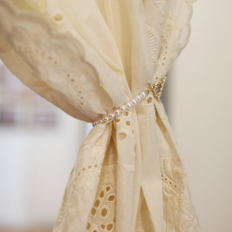 淘宝鸢尾乡旅米色棉布水晶珠美式穿杆柜门帘纯色半帘帘头短帘免打孔帘