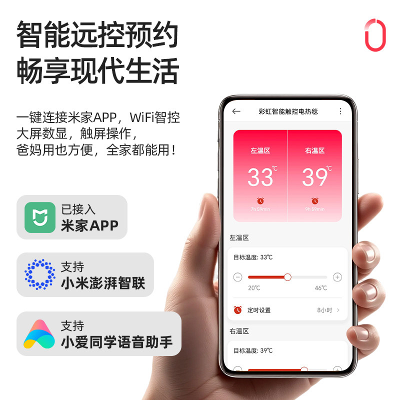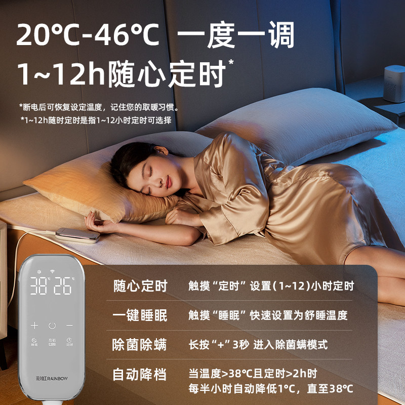 彩虹电热毯双人双控调温WIFI智能电褥子,集舒适、安全与便捷于一体。采用双人独立温控设计,左右两侧可分别调节温度,满足不同睡眠需求。支持WIFI连接,通过手机APP实现远程操控,随时随地开启或调节温度,回家即享温暖。毯体可安全水洗,清洁更省心。优质面料柔软亲肤,内置过热保护与安全断电技术,使用更安心。智能定时功能助您节能省电,安心入眠。无论是寒冬夜晚还是寒冷清晨,这款智能电热毯都能为您提供恰到好处的温暖守护,是现代家庭舒适生活的理想之选。