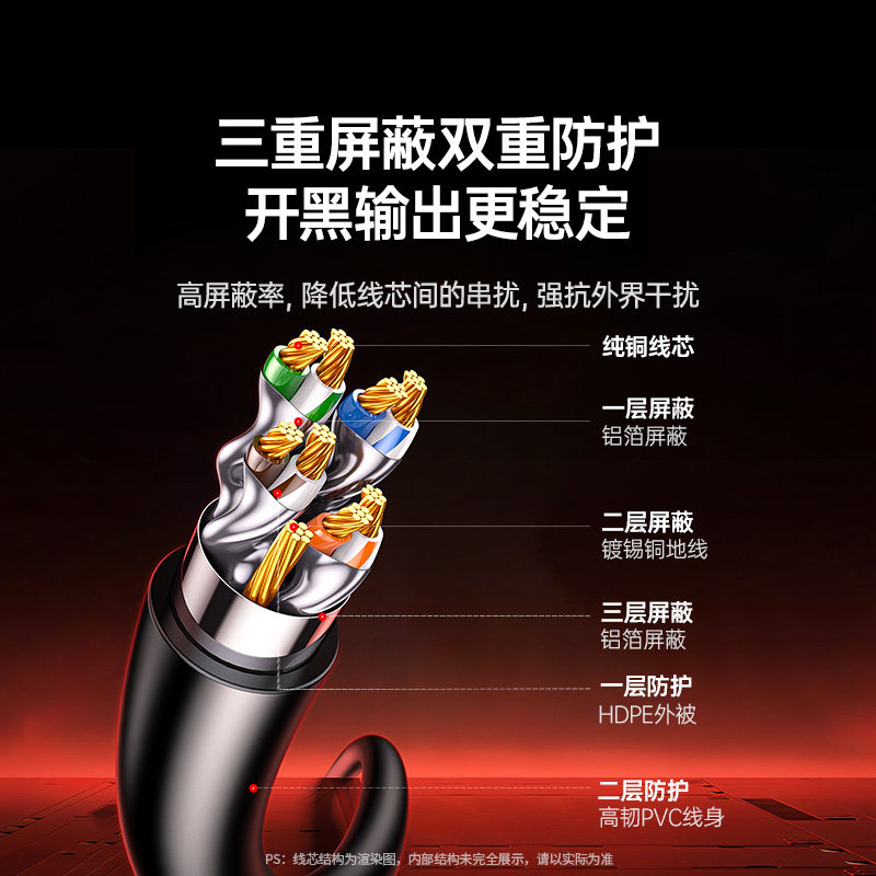 绿联八类网线(Cat8)专为千兆/万兆高速网络设计,支持高达2000MHz带宽和40Gbps传输速率,适用于家庭电竞、高清影音及大型文件传输等高带宽场景。采用双屏蔽结构(S/FTP),有效抗干扰,确保信号稳定低延迟。兼容路由器、电脑、交换机、NAS等设备,向后兼容Cat7、Cat6e等规格。线芯采用高纯度无氧铜,传输更稳定,耐用性强。扁平或圆线设计,便于理线与布线,适合现代家居环境。无论是万兆宽带接入、在线游戏还是4K/8K视频流,绿联Cat8网线都能提供流畅、极速的网络体验,是追求高性能网络用户的理想选择。